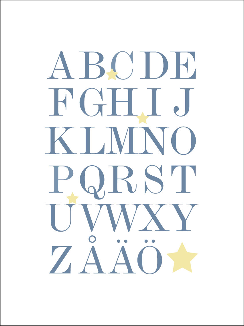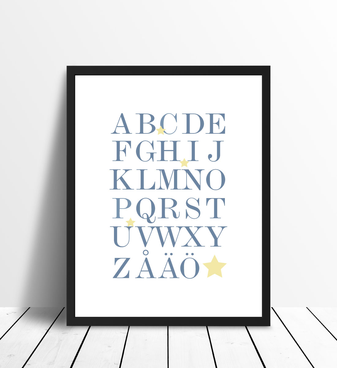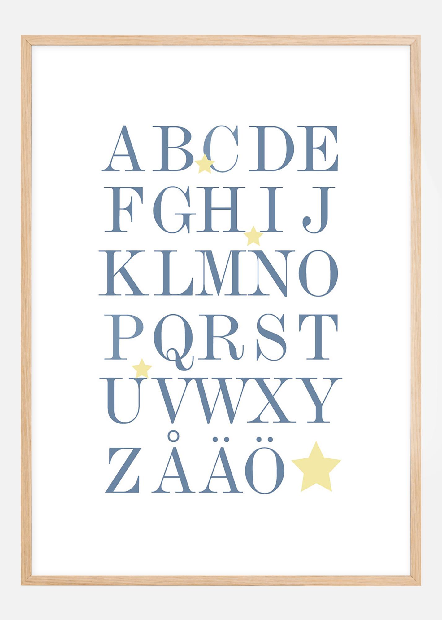 Plakat med hele alfabetet, fra A til Å, i blått og stjerner i beige. Det pedagogiske motivet passer fint på barnerommet for å øve på alfabetet, men ser også bra ut på andre vegger i hjemmet. Det stilige uttrykket gjør at plakaten passer til alle interiørstiler og i alle hjem. Kombiner gjerne med andre bilder for å skape en tematisk bildevegg eller dekorer veggen sammen med plakaten med tallene 1-10.