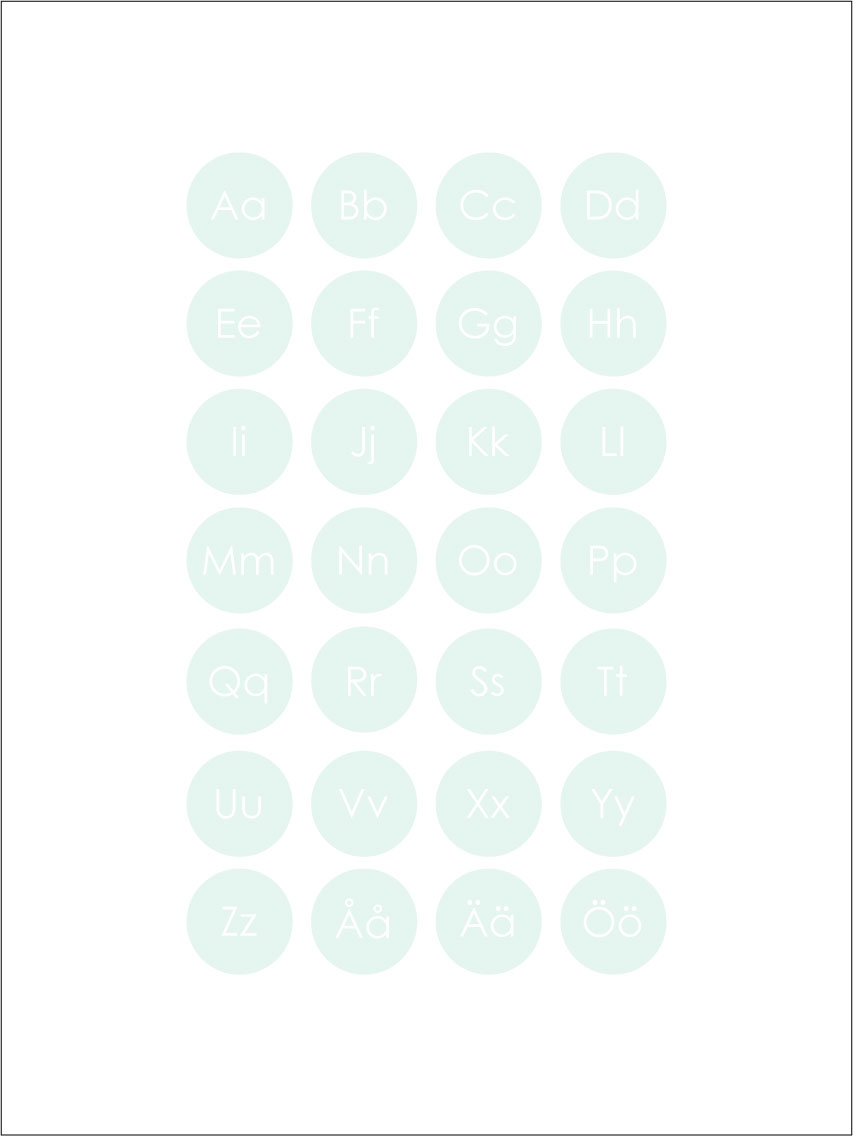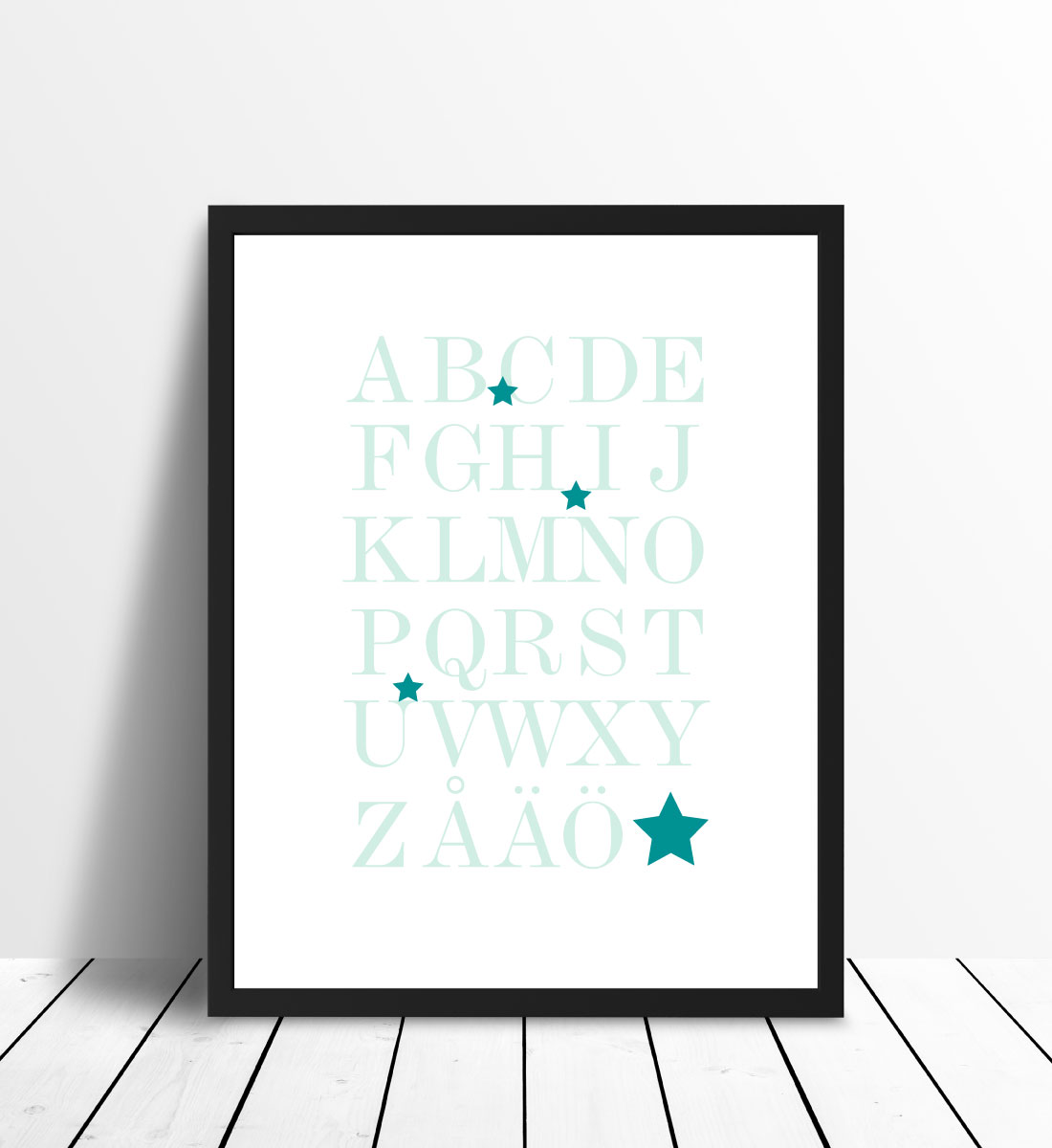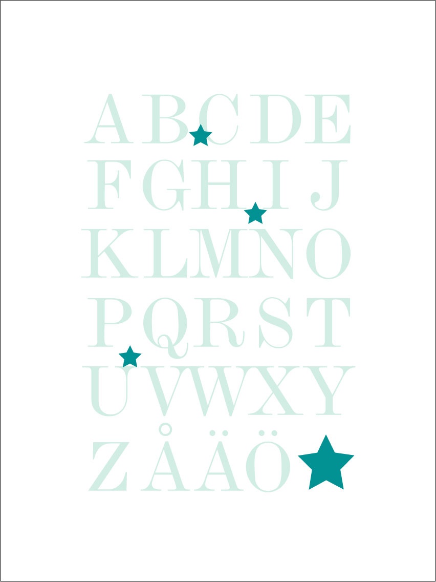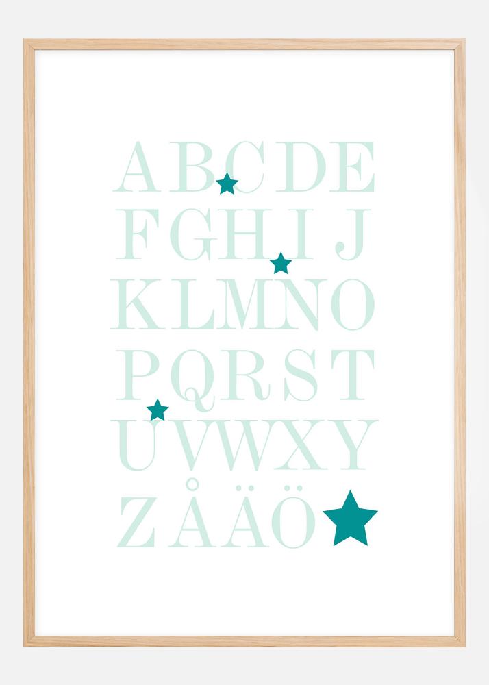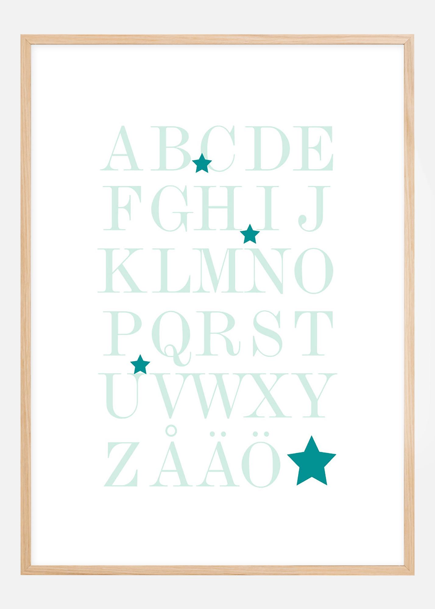 Grafisk trykk med hele alfabetet, fra A til Å, i havets grønnturkise nyanser. Det pedagogiske motivet passer fint på barnerommet for å øve på alfabetet, men ser også bra ut på andre vegger i hjemmet. Det stilige uttrykket gjør at plakaten passer til alle interiørstiler og i alle hjem. Kombiner gjerne med andre bilder for å skape en tematisk bildevegg eller dekorer veggen sammen med plakaten med tallene 1-10.