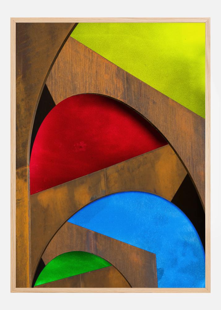 En lys abstrakt plakat med fargerike former. Primærfargene fyller stykket med røde, gule og blå halvsirkelformer. Formene låses sammen med rettkantede effekter og former i tre, med en grønn skive nederst. Gi nytt liv til en ordinær vegg, eller match med en eksisterende dristig farge for å få fram det komplette utseendet.