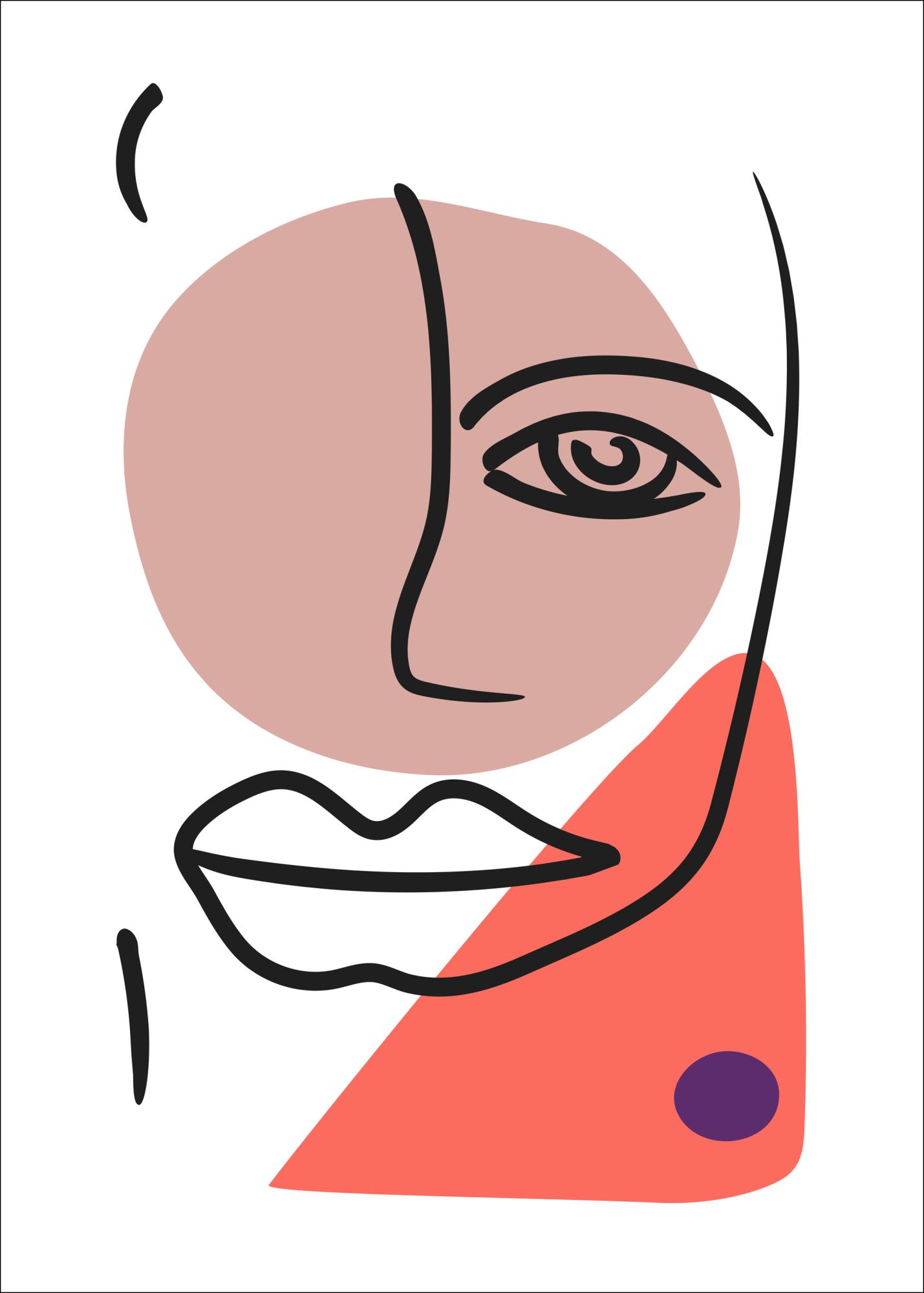 En abstrakt plakat av et ansikt komplett med både øyne, nese og fyldige lepper. Ansiktets svarte linjer er plassert på en rosa sirkel og ferskentrekant for en dramatisk effekt. Tolk følelsene og bli inspirert på daglig basis med denne unike plakaten som fremkaller strålende fantasi.