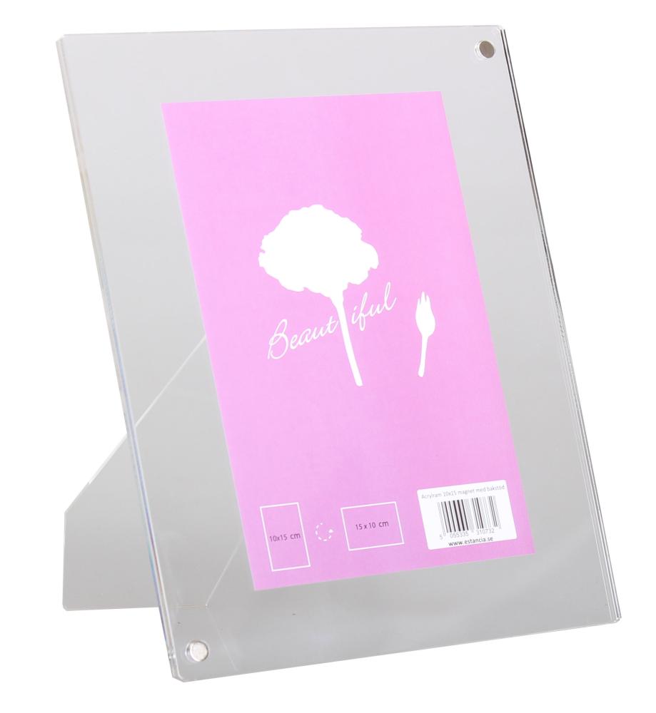 Akrylramme som består av 2 stk. tykke akrylplater som holdes sammen av magneter. Rammen har ytre dimensjoner på 15x20 cm, som gjør at den kan brukes sammen med et valgfritt motiv i størrelsen 15x20 cm eller mindre. Størrelsen på bildet i eksempelet er 10x15 cm.