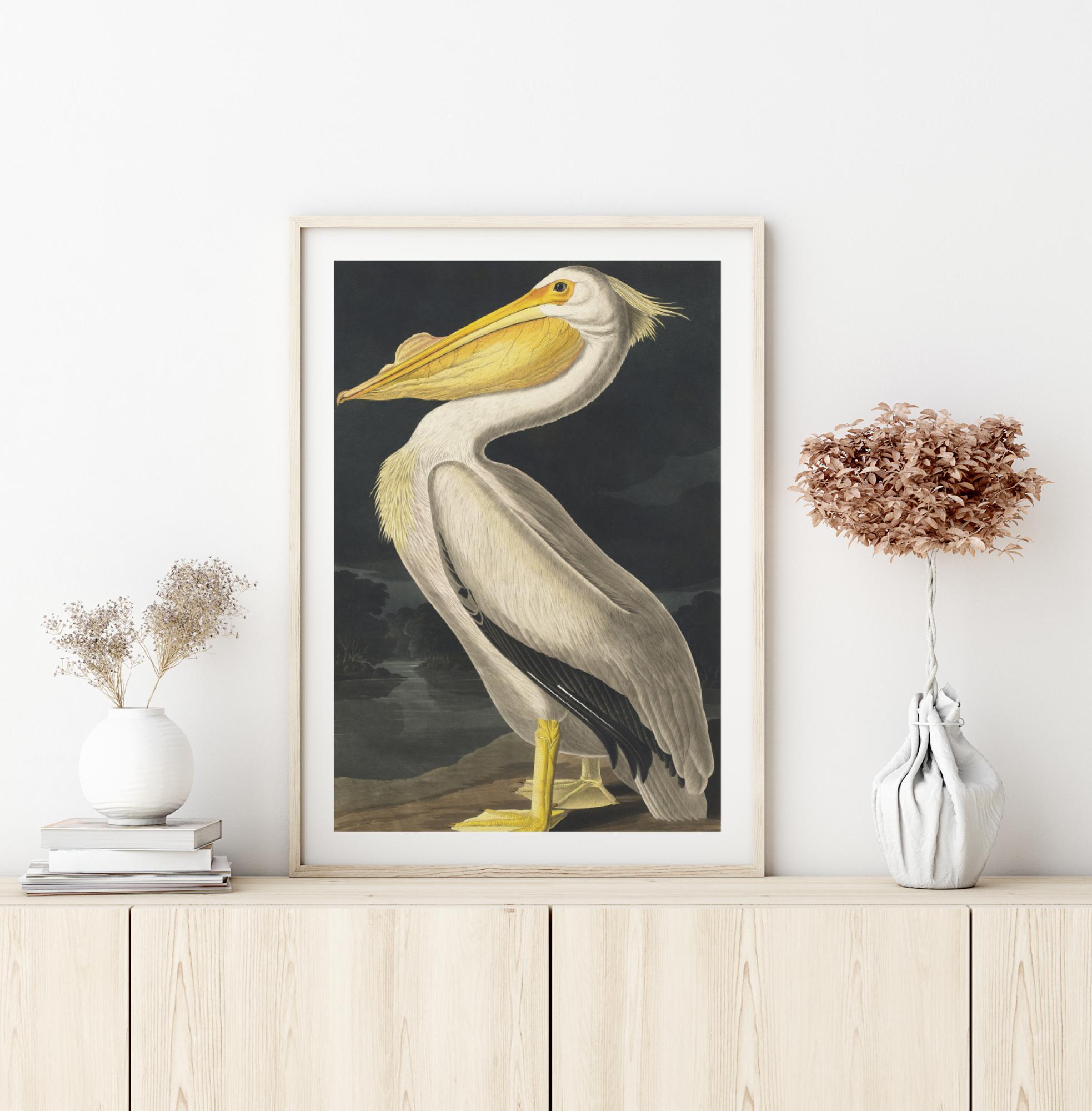 En naturplakat av en malt pelikan. Denne strenge fuglen sitter høy og stolt med det kraftige gule nebbet stukket inn i brystet. Sterke gule føtter og det hvite fjærkledde brystet står skarpt mot det mørke, dempede landskapet bak. Tilfør et preg av gammeldagse malerier til hjemmet med dette fantastiske bildet.