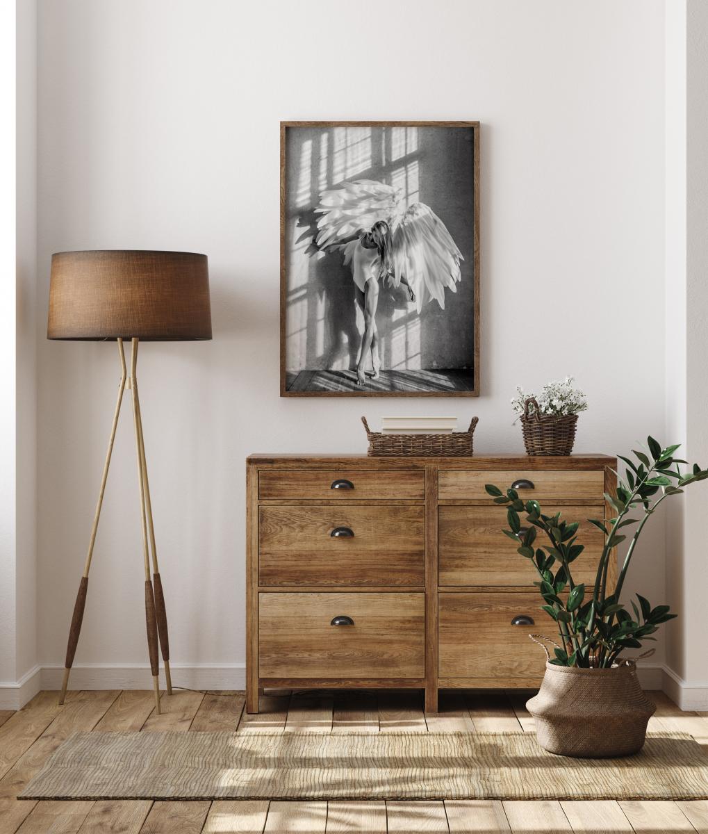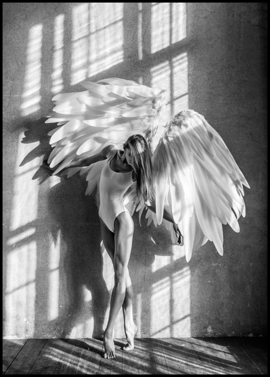 En herlig fotokunst poster i myk gråskala av en kvinne som poserer som en ballerina med et par store englevinger i lyset fra et gigantisk vindu hvis skygger spiller over bildet. Dette er en poster for den som ønsker et mykt og vakkert innslag i sitt hjem.