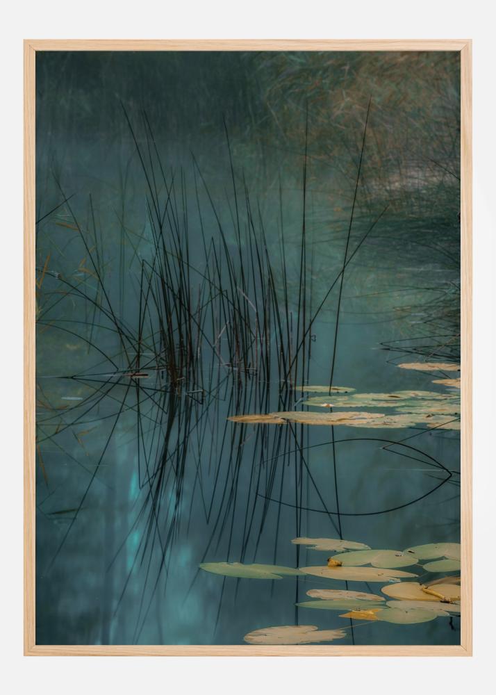 En naturplakat av en fantastisk vannblå lakk fylt med Lilly-blokker og lesninger. De myke fargene smelter sammen for å skape et virkelig rolig bilde, og det stille vannet skaper perfekte refleksjoner fra sivet. Bli ett med naturen når du henger dette på veggen din og går deg vill i freden.
