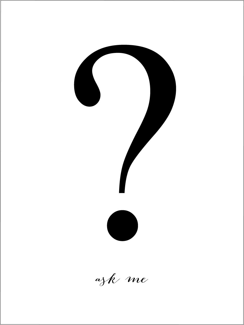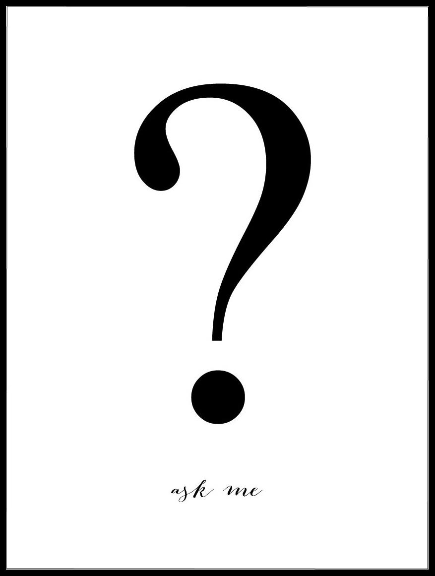 Stilig grafisk trykk, Ask me, med tekst og et stort spørsmåltegn i svart skrift på hvit bakgrunn. Vakker sammen med andre plakater på en bildevegg i stuen, eller du kan la gjestene vite at du er en åpen person allerede i gangen. Plakaten ser godt ut sammen med andre typografiske motiver fra samme serie - Ask me, Do me eller Share me.