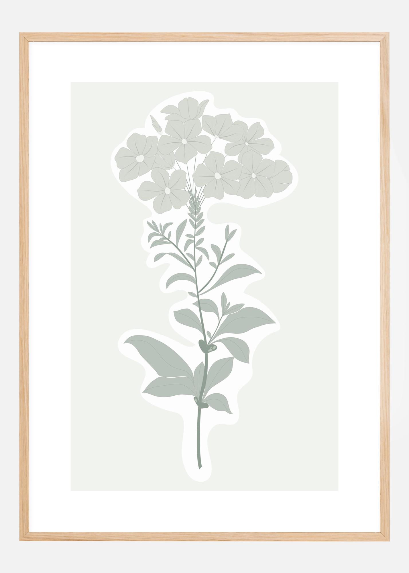 En blomsterplakat med en enkel botanisk utskrift av en blomst og bladene dens. Myke grå og grønne farger utgjør denne enkle, men elegante stilken med blomster. Innrammet i hvitt da grå, bringer plakaten liv til gamle botaniske illustrasjoner. Vis fram gartneren i deg med denne søte plakaten.