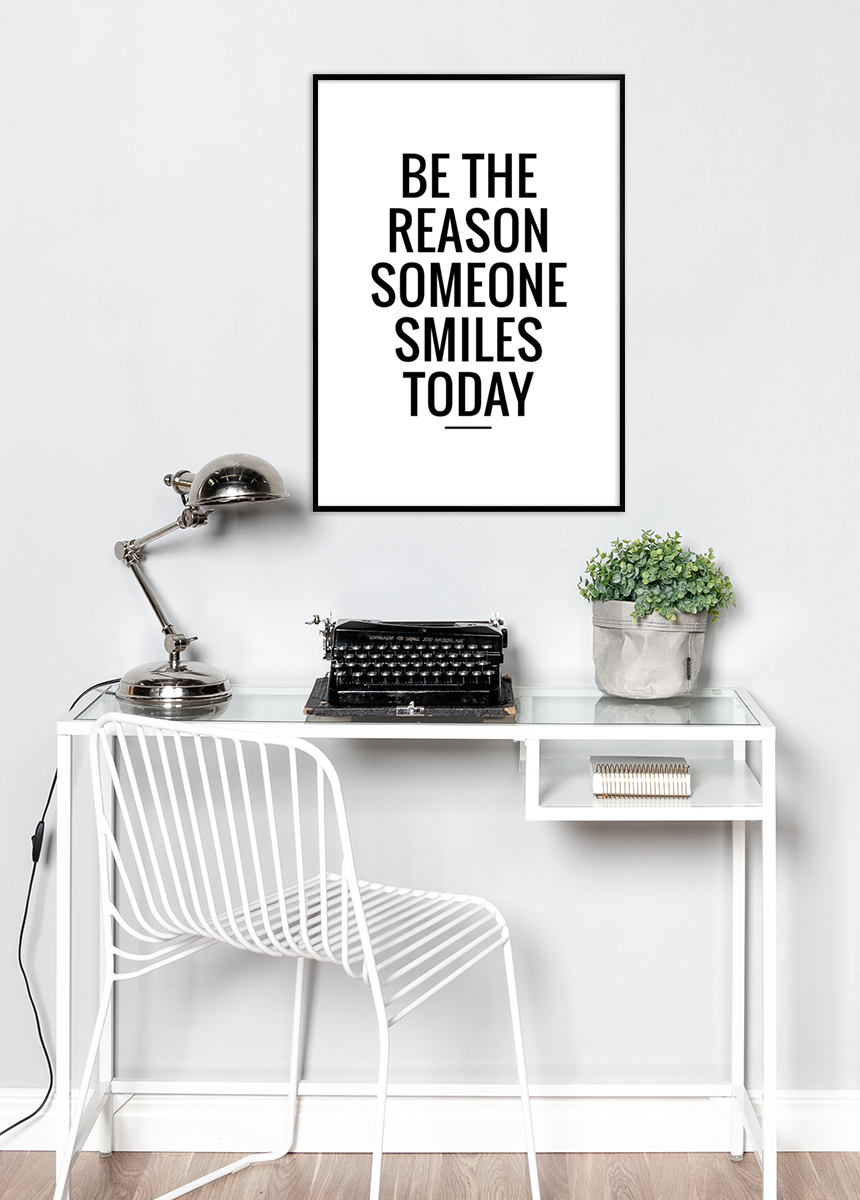 Hva er det fineste du som medmenneske kan gjøre for en annen? Selvfølgelig finnes det en rekke ulike gjerninger å velge mellom, men til syvende og sist er det smilet du får i respons som er viktigst! Denne stilfulle printen gir en fin og viktig veiledning i hverdagen. Posteren er hvit og har et svart trykk med teksten "Be the reason someone smiles today". Ettersom den er svarthvit kan den med fordel kombineres med dine favorittfarger på rammen eller passepartoutet. Finnes i 6 ulike størrelser og prisklasser.