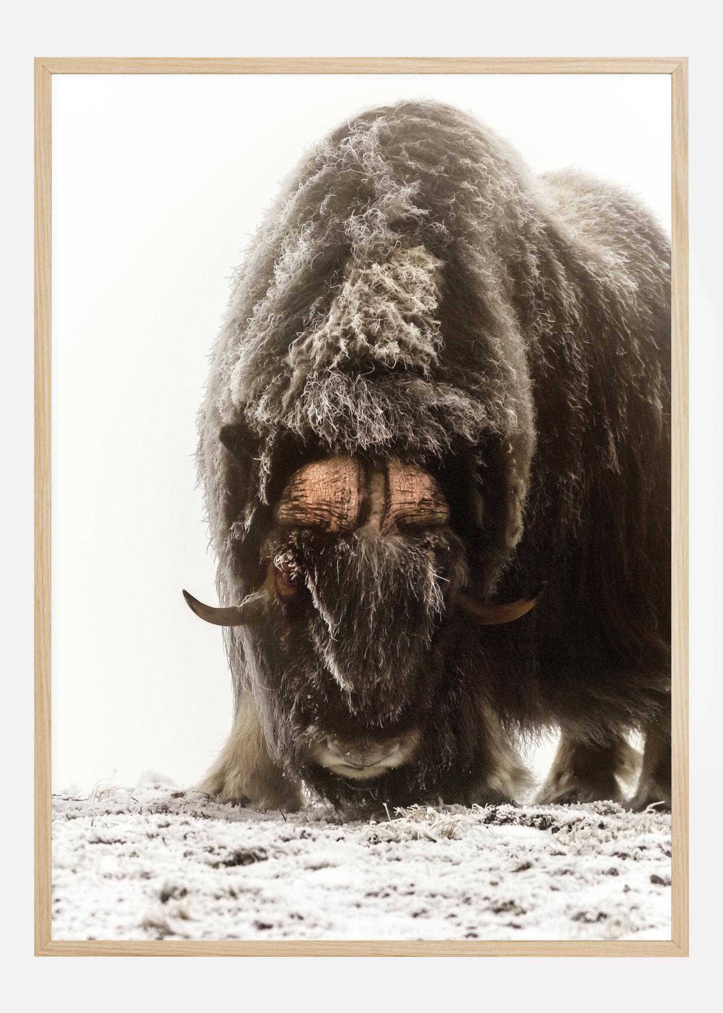 En dyrelivsplakat av en snødekt jak. Jakens lange frodige pels ser myk og frodig ut der han står rett foran kameraet og leter etter mat. Den snøhvite bakgrunnen gjør at han skiller seg ut, og tilfører dramatikk til bildet. Heng dette opp på veggen din for en vinterlig følelse.