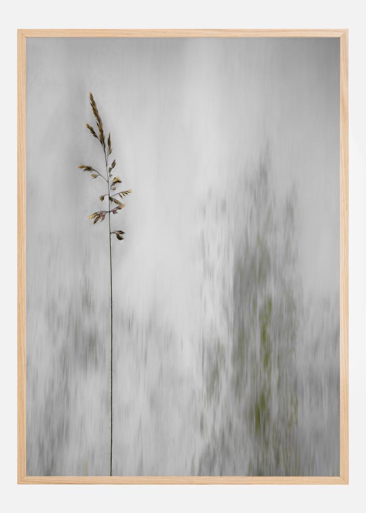 En myk plakat av en enkelt gressblomststilk mot en myk grå bakgrunn. Gressbladets gullfarge skinner klart mot det myke fokuset på bakgrunnen som holder blikket ditt. Heng dette hjemme på en nøytral vegg for et snev av det magiske i dette enkle, men likevel stemningsfulle, stykket.