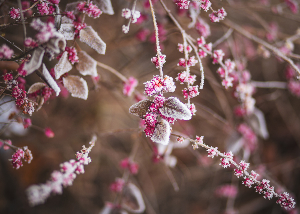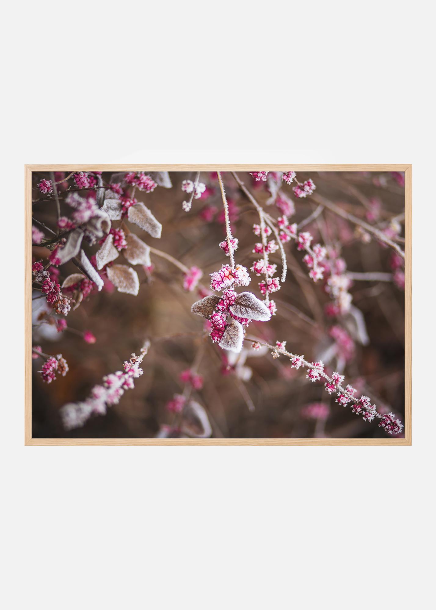 Fotokunst med nærbilde av frosne rosenrøde bær med kort dybdeskarphet som motiv. Med rosa bær i forgrunnen og varme sjokoladenyanser i bakgrunnen gir bildet en varm og koselig følelse. I en stor størrelse med en fin ramme blir plakaten et blikkfang i stuen eller plasser gjerne en mindre versjon av plakaten i en collage med andre bilder i samme nyanser.