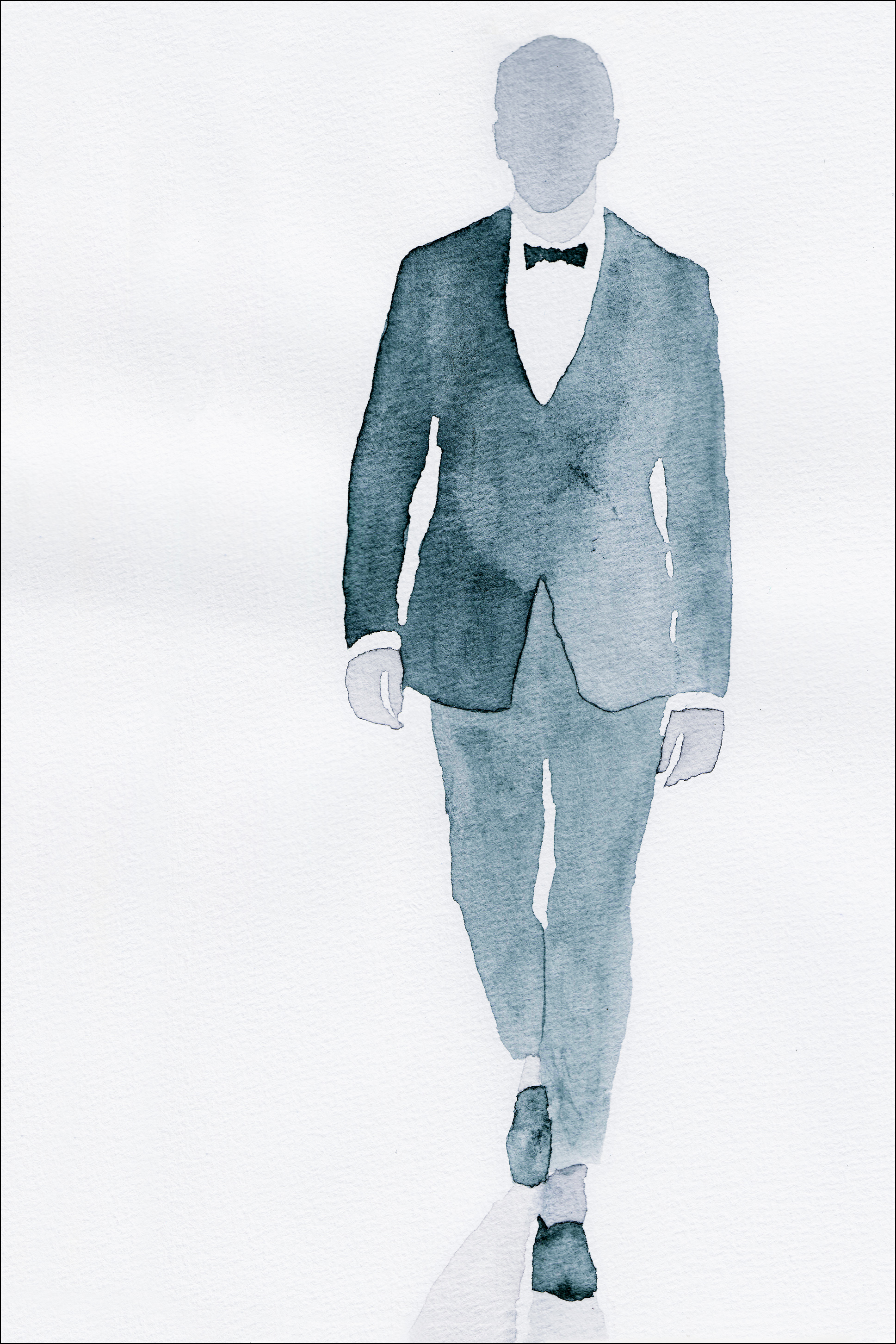 En portrettplakat av en mann i smoking som går fremover. Enkel, men vakker; dette blå laveringsmaleriet gir deg figuren uten å vise noen detaljer om ansiktet hans. Hvem er den mystiske mannen? Det er opp til deg å bestemme når du tar med denne plakaten hjem.