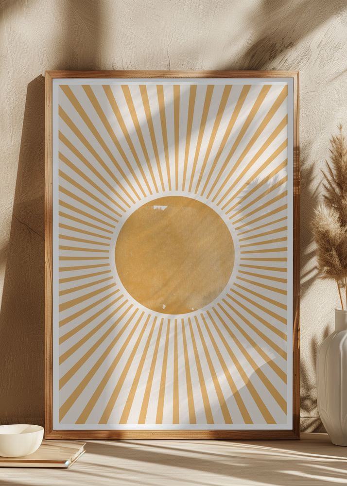 Dette trykket kan lyse opp hvilket som helst rom og gi en touch av boho-chic til din innredning. Den er perfekt for de som vil innføre et stykke av naturens skjønnhet og en følelse av lys inn i sitt hjem. Dens universelle symbol for solen gjør den til et velkomment tillegg i mange forskjellige innredningsmiljøer, fra en stue til et yogarom eller et barnerom.