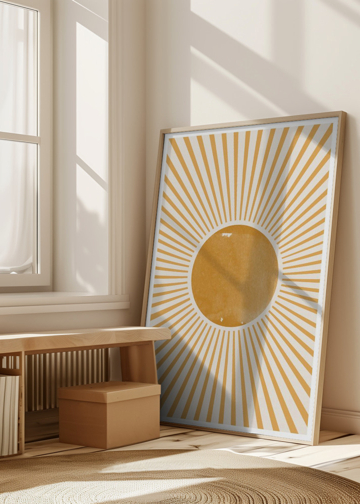 Dette trykket kan lysne opp hvilket som helst rom og gi en touch av boho-chic til din innredning. Den er perfekt for de som vil innføre en bit av naturens skjønnhet og en følelse av lys i sitt hjem. Dens universelle symbol for solen gjør den til et velkomment tillegg i mange forskjellige innredningsmiljøer, fra en stue til et yogarom eller et barnerom.