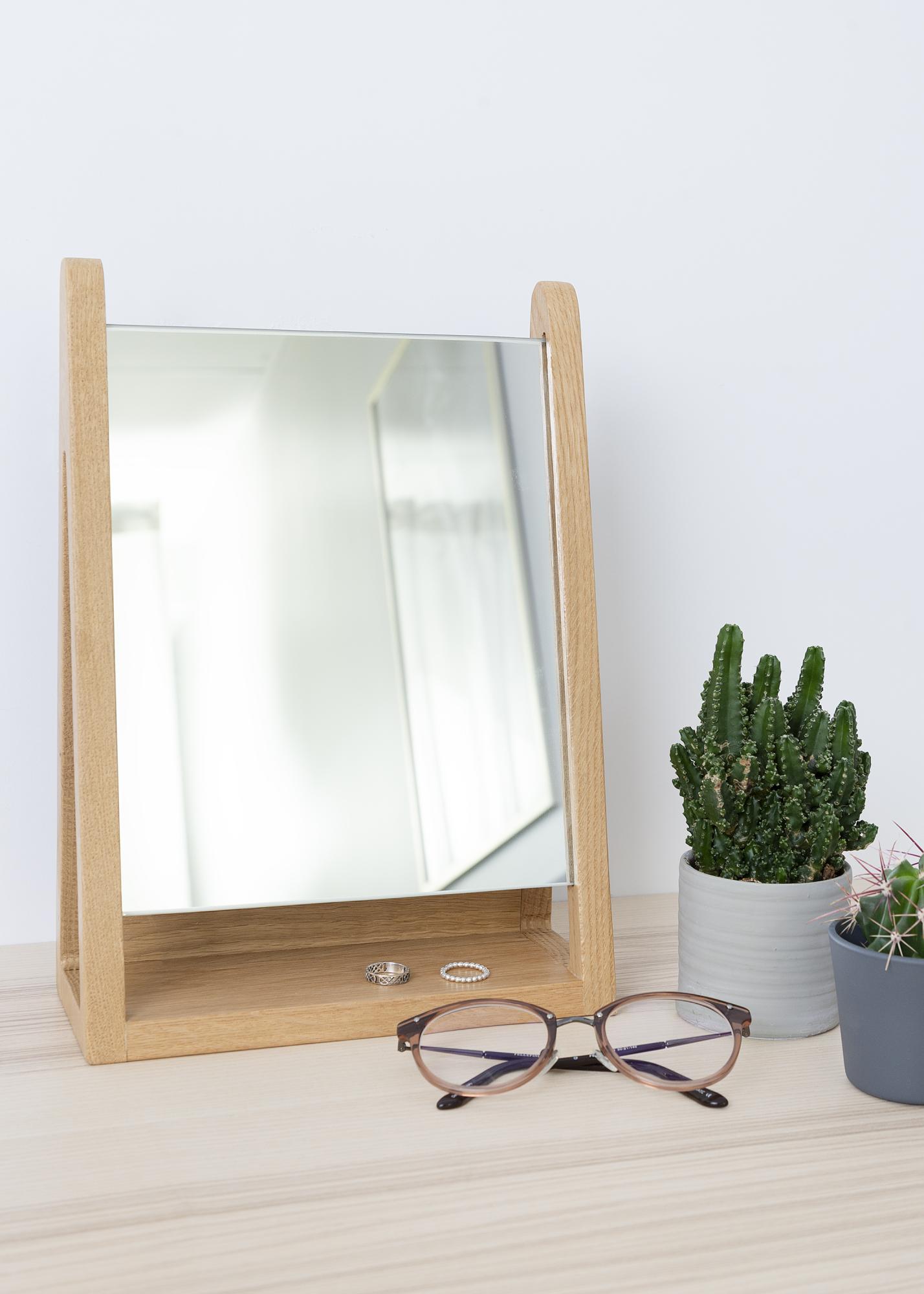 Dette bordspeilet har et enkelt og nøysomt – men samtidig kreativt og smart – design. Den stilrene støtten er laget i tre, og bunnen lager en liten brikke der man hendig kan legge sine små krimskramserier, for eksempel smykker eller klokke.