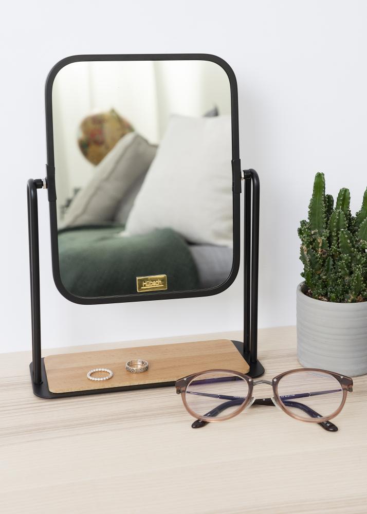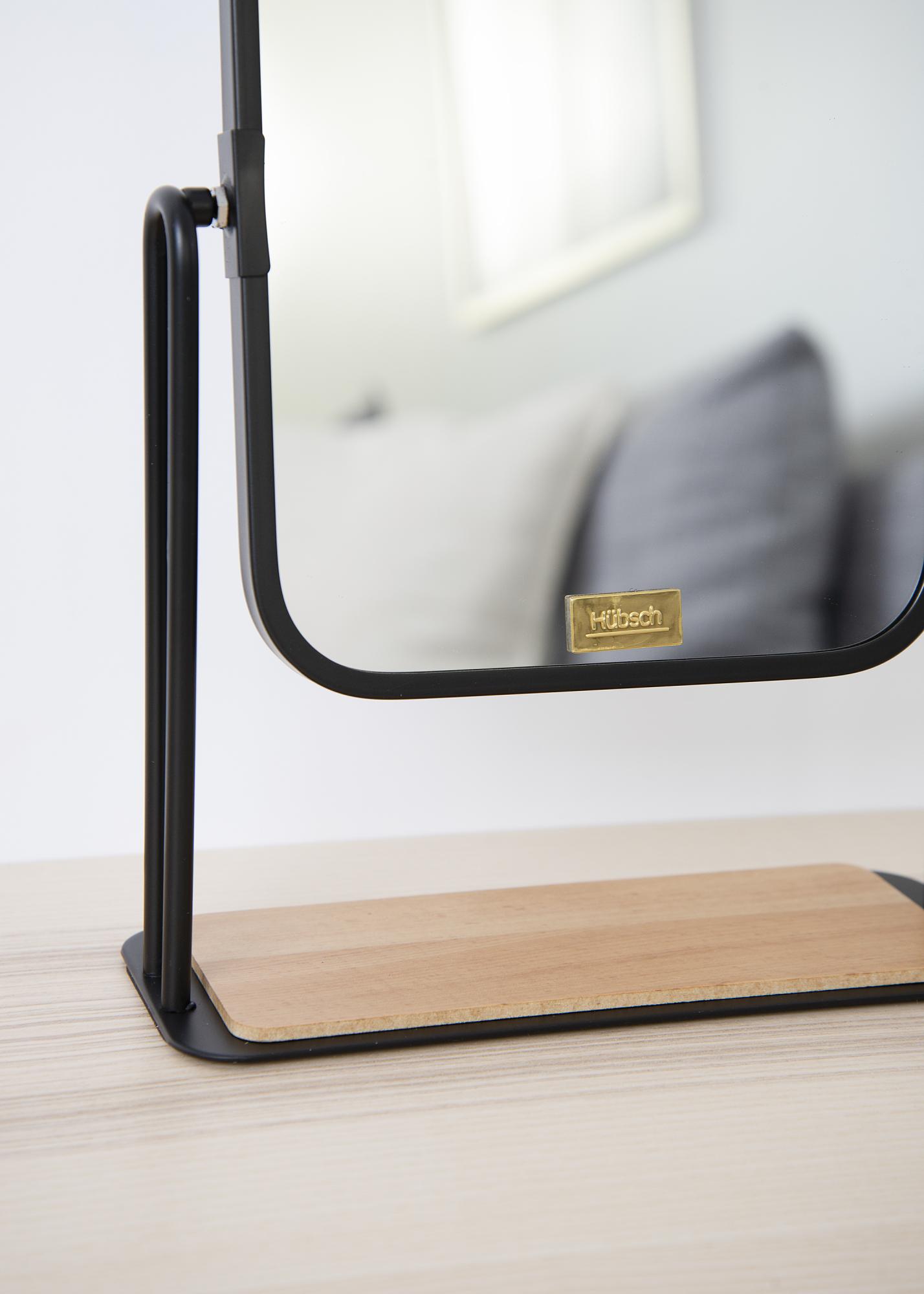 Dette bordspeilet er både pent og funksjonelt på flere måter. Speilet er rektangulært og er omkranset av en tynn og stilren ramme i svart metall. I bunnen av støtten er det en liten trebrikke som er perfekt til å oppbevare små krimskramserier.