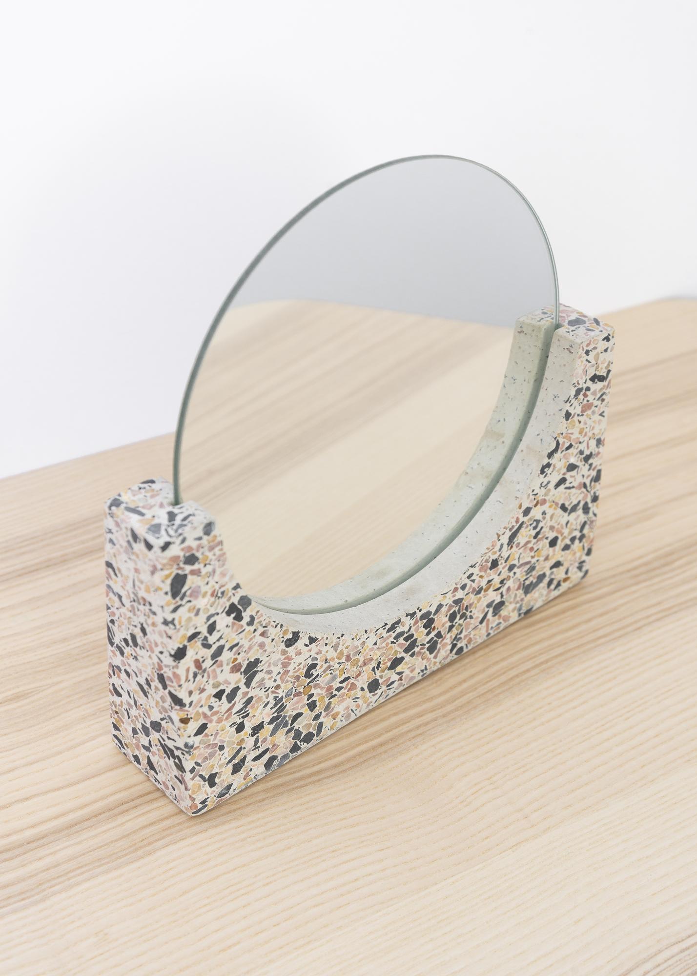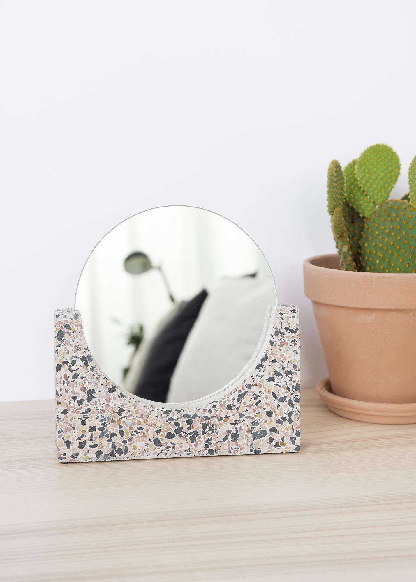 Dette runde bordspeilet er et kunstverk i seg selv! En stilig og robust støtte i vakker hvit Terrazzo (kunststein) gjør dette speilet til mye mer enn bare funksjonelt. Speilet er en stilig innredningsdetalj som tilfører moderne design i det rommet du velger å plassere det i.