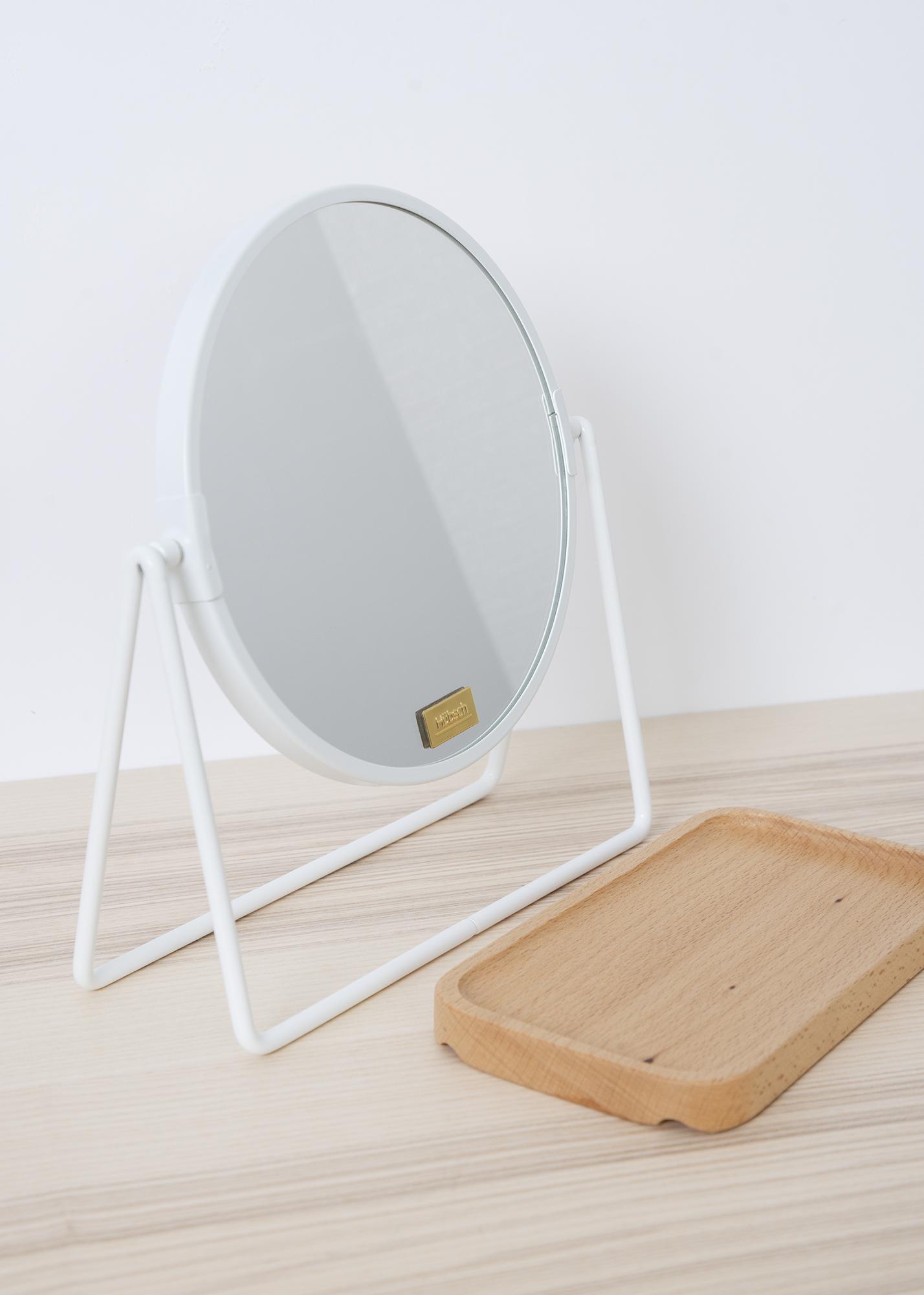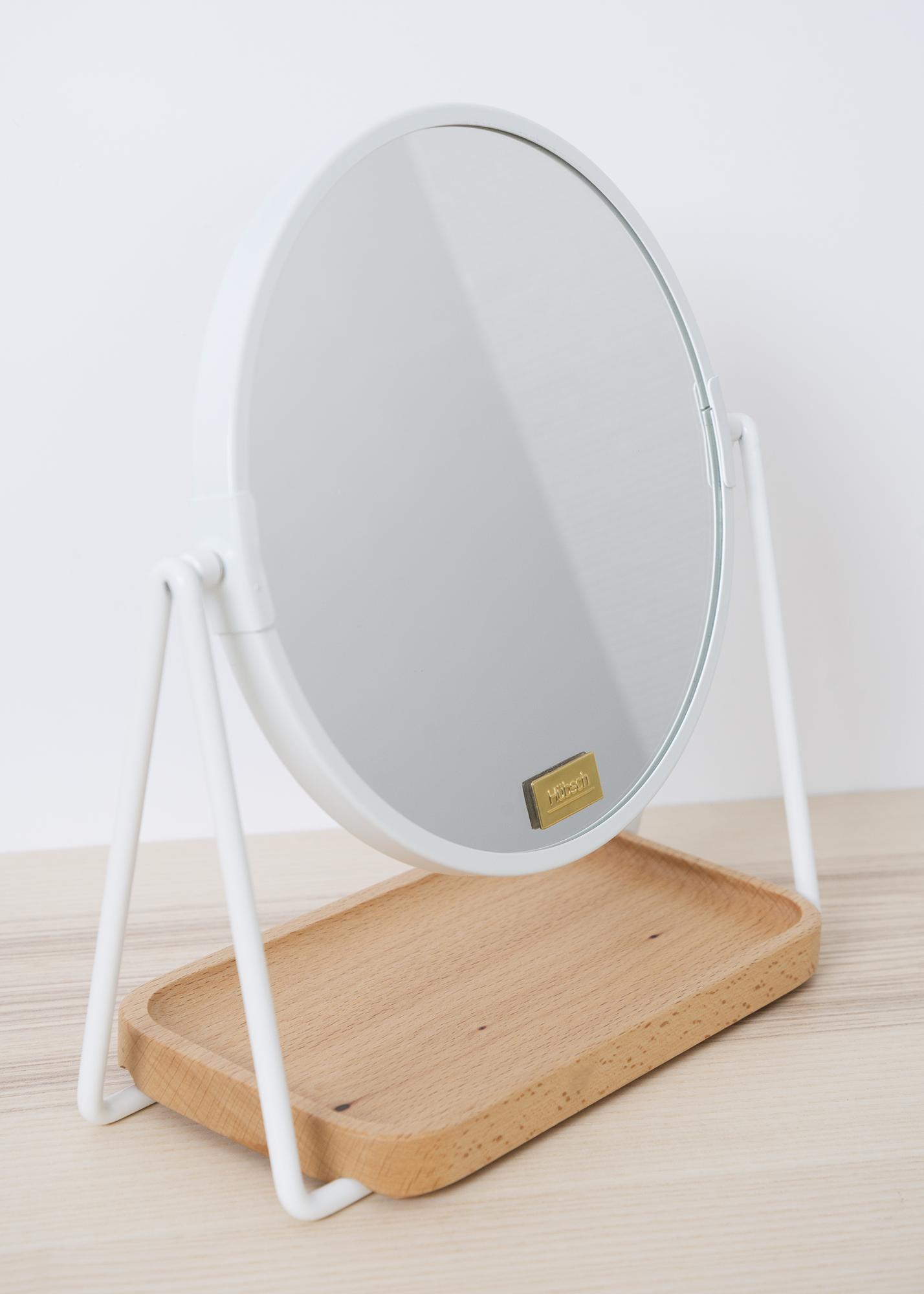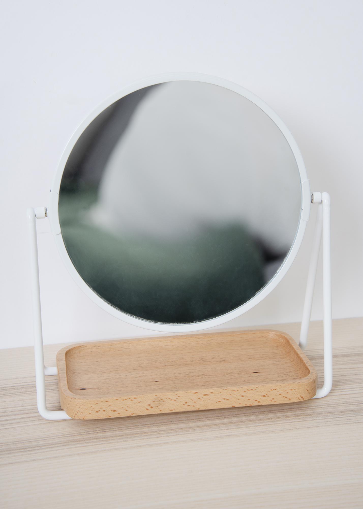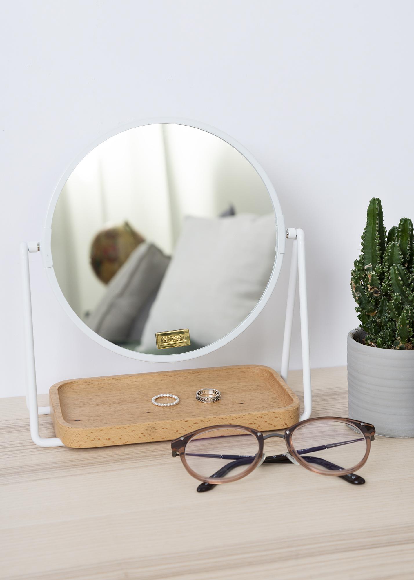 Dette runde bordspeilet har et både dekorativt og smart design! Den stilrene rammen og støtten i hvitfarget metall gjør at dette speilet passer til alle typer innredning, klassisk så vel som moderne. Den fine brikken i tre er et perfekt sted å legge fra seg små ting man ellers lett kan miste, for eksempler smykker eller nøkler.