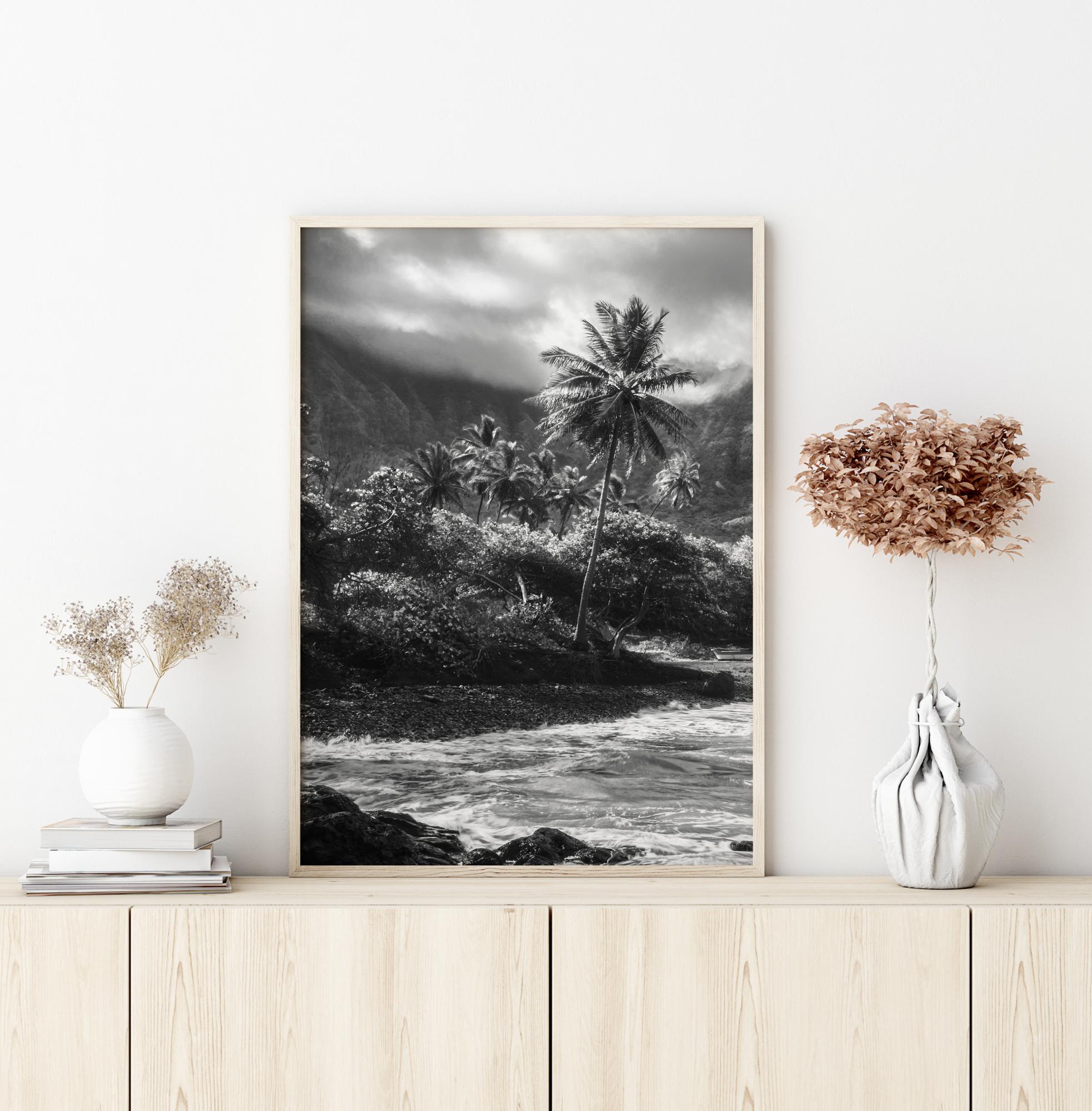 En naturplakat av en innkommende storm der hav møter land. En overskyet himmel mørkner bildet der palmetrærne svinger i vinden. Det skummete havet treffer den steinete kysten og skaper en forestående handling. Bring drama til ditt hjem når du henger denne svarte og hvite utskriften på en nøytral vegg.