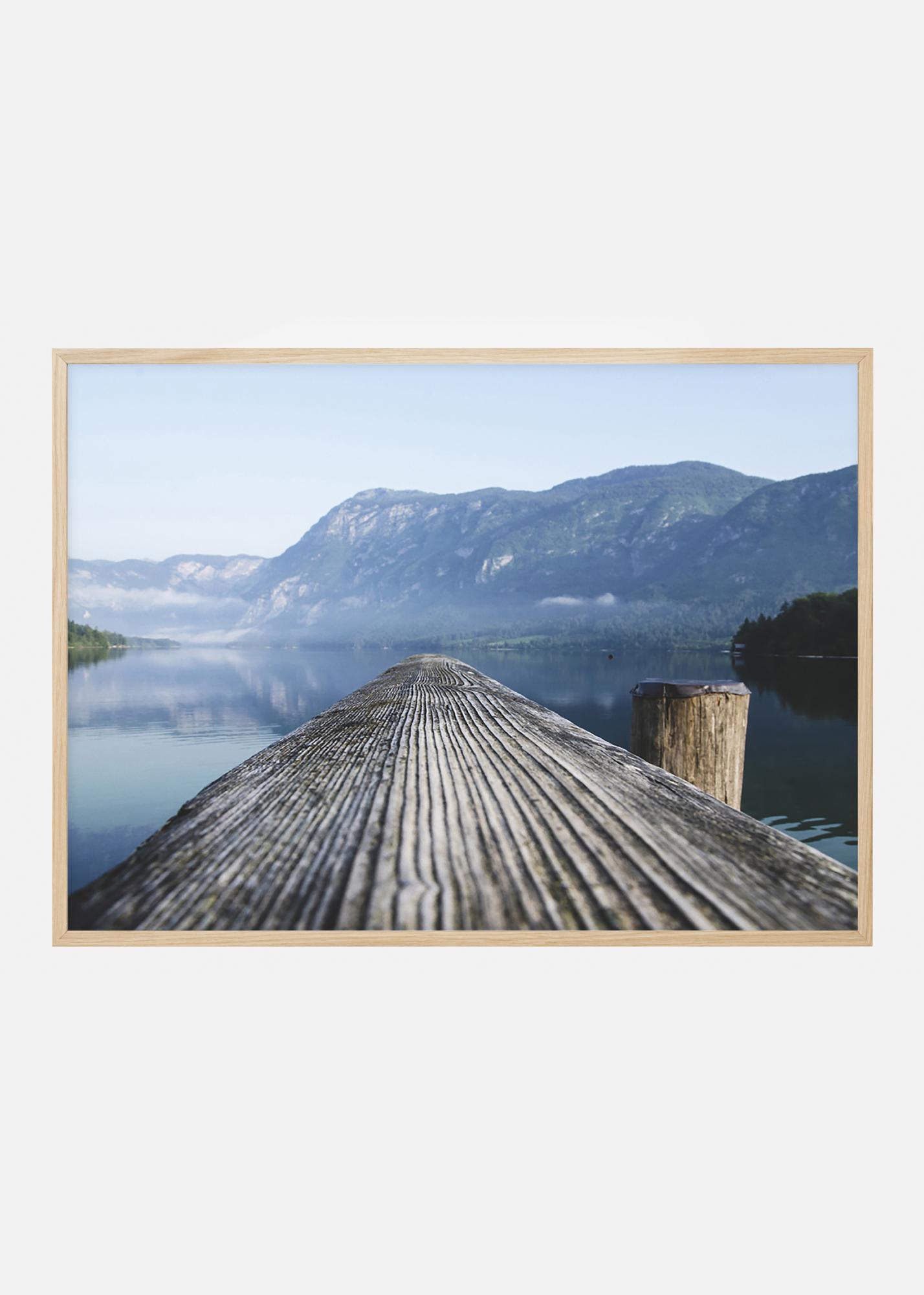 Utsikt over et praktfullt fjordlandskap fra en værbitt brygge. Landskapskomposisjon med blåtoner som passer like godt alene på veggen som sammen med annet tilbehør med marine tema, eller andre plakater. Komplementer gjerne med en grå treramme, som forsterker fargene i plakaten, eller en tynn svart ramme for et mer minimalistisk utseende.