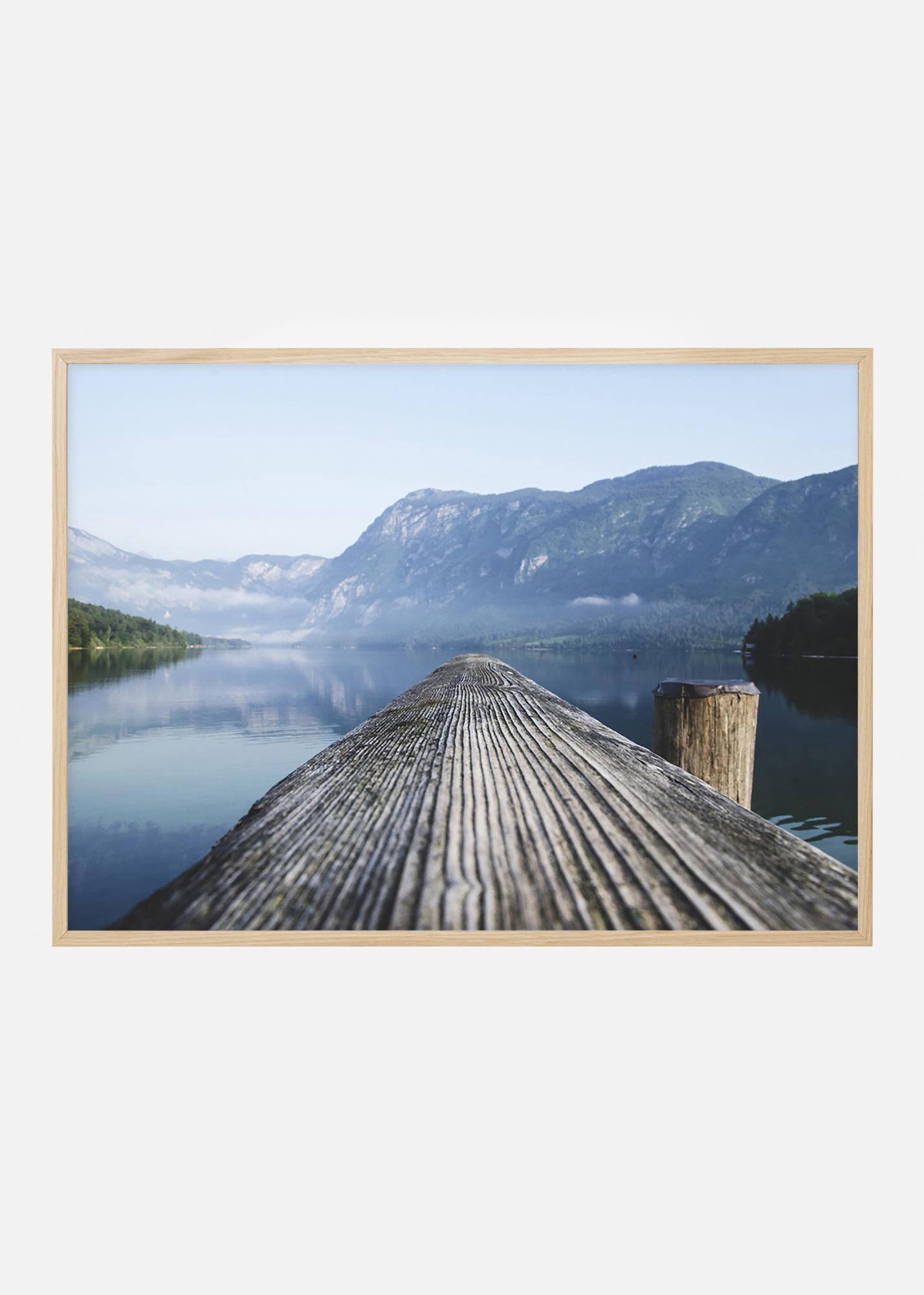 Utsikt over et praktfullt fjordlandskap fra en værbitt brygge. Landskapskomposisjon med blåtoner som passer like godt alene på veggen som sammen med annet tilbehør med marine tema, eller andre plakater. Komplementer gjerne med en grå treramme, som forsterker fargene i plakaten, eller en tynn svart ramme for et mer minimalistisk utseende.