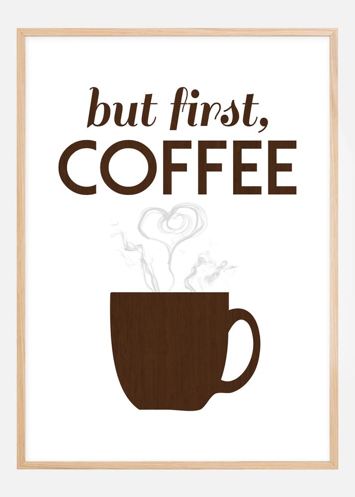 Plakat med det bevingede uttrykket -But first, coffee. Og er det ikke slik at alt blir bedre med en kopp kaffe først? Plakaten med et trykk som har en følelse av tre er den perfekte gaven til den som ikke kan leve uten sin kopp java om morgenen. Den passer også utmerket på arbeidsplassen der man vil klargjøre prioriteringsrekkefølgen. Kompletter plakaten med en ramme som matcher den øvrige innredningen eller velg en ramme i mørkt tre for å ta opp tre-følelsen i motivet.