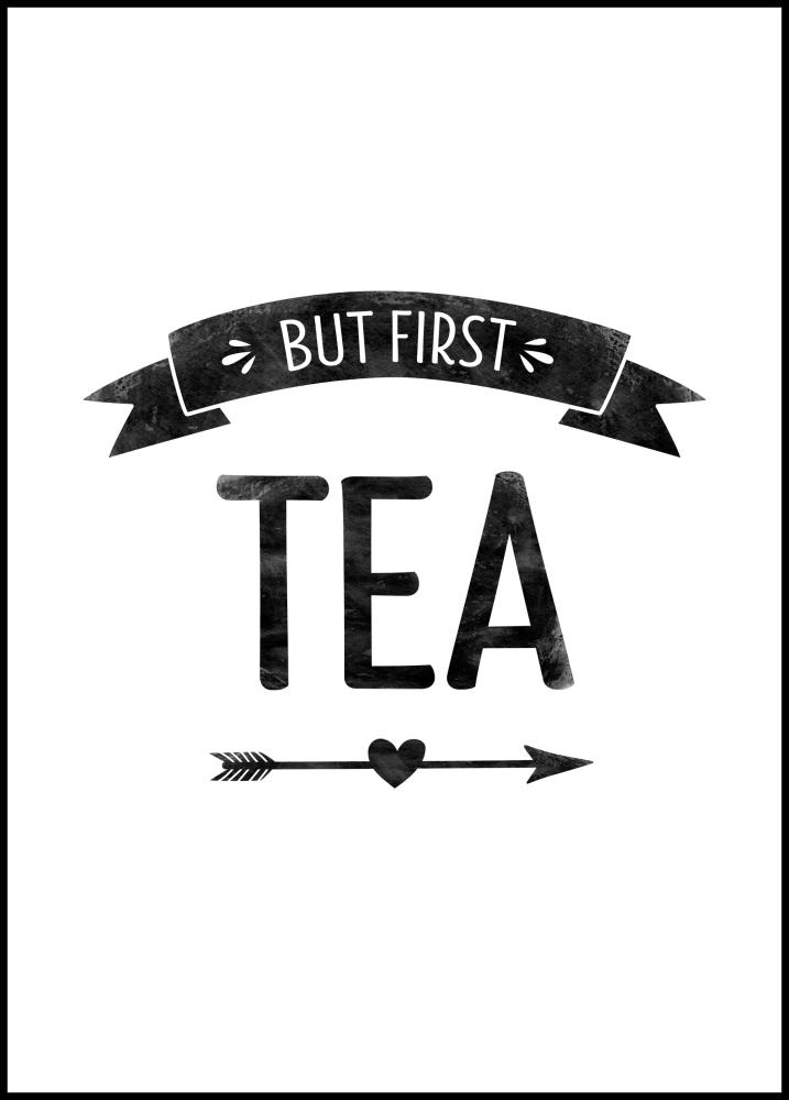 Gjør du som engelskmennene og drikker velluktende te i stedet for kaffe? Skap den rette tedrikkefølelsen med denne sjarmerende retroposter! Plakaten går i hvitt med et svart trykk i form av teksten “But first tea” sammen med med et bånd og en pil som går gjennom et lite hjerte. Velg format etter behag og kompletter gjerne med en ramme og et passepartout i en stilig fargekombo. Inviter senere alle dine venner på afternoon tea!
