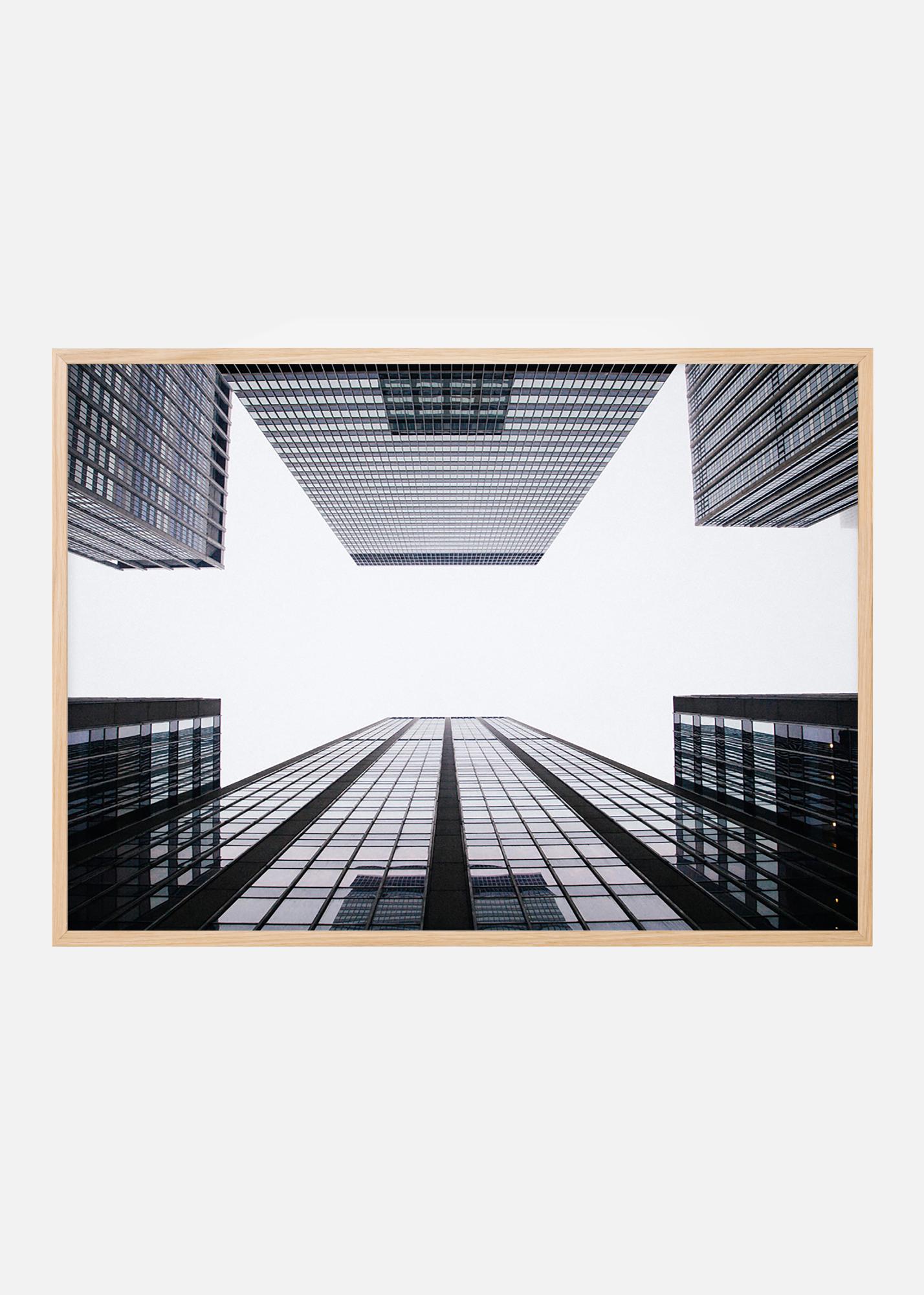 Arkitekturplakat med høye skyskrapere mot en sky-hvit himmel. Stilrent bilde av mørke bygninger mot en hvit bakgrunn, med himmelen som reflekteres i vinduene. Perfekt gave for de som liker grafiske by-portrett. Bildet passer bra i en svart ramme som tar igjen det mørke i bildet og sammen med andre fotografier av arkitektur.