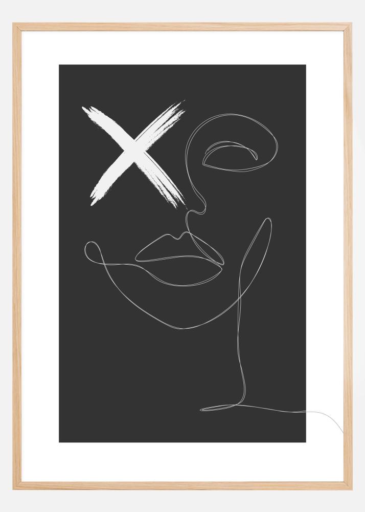 En abstrakt plakat av et ansikt tegnet i tynne hvite linjer på en svart bakgrunn. De hvite linjene er alle sammen med å skape ansiktet i en jevn bevegelse. Hvor ett øye skal være er et dramatisk hvitt kryss. Hva betyr det? Bruk denne for å ha kunstsamtaler hjemme.