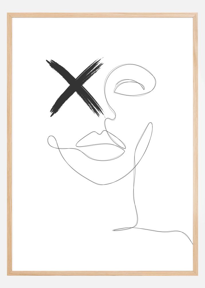 En abstrakt plakat av et ansikt tegnet med en tynn svart linje på en lys, hvit bakgrunn. Linjen er trukket med én eneste bevegelse for å tegne ansiktet. Over ett øye er det et stort svart kryss. Heng dette på en fargerik vegg som et flott snakkepunkt i ditt hjem.