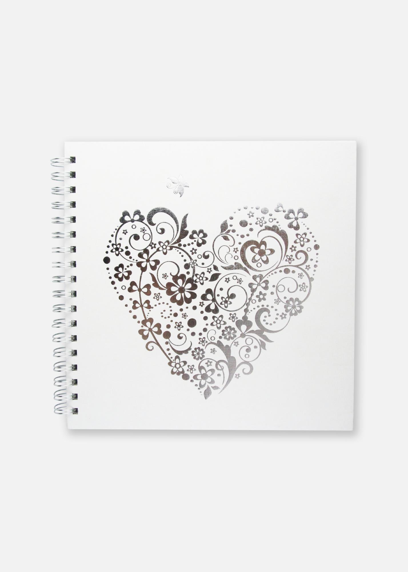Søt spiralalbum i hvit i størrelsen 18x18 cm. På framsiden er det en sølv hjerte trykt med fine blomsterdetaljer. Albumet inneholder 24 syrefrie sider i hvit og er en perfekt album som kan ligge framme uten å ta for mye plass.