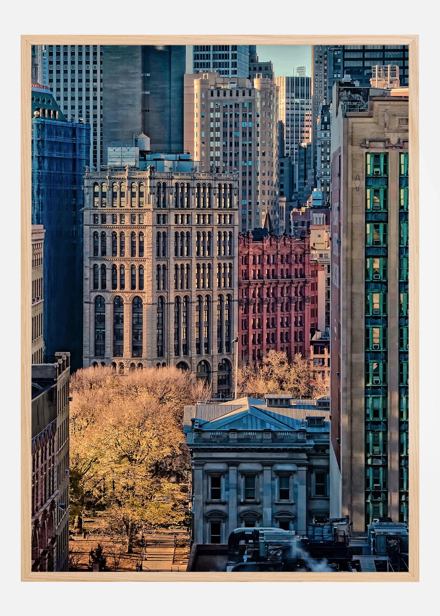 En urban landskapsplakat med gamle og nye bygninger sammen. Høsttrær og røde mursteinbygninger kontrasterer på en fantastisk måte til skyskrapernes kaldere blåtoner. Tenk deg at du ser ut av vinduet ditt i denne travle byscenen når du henger opp plakaten hjemme.