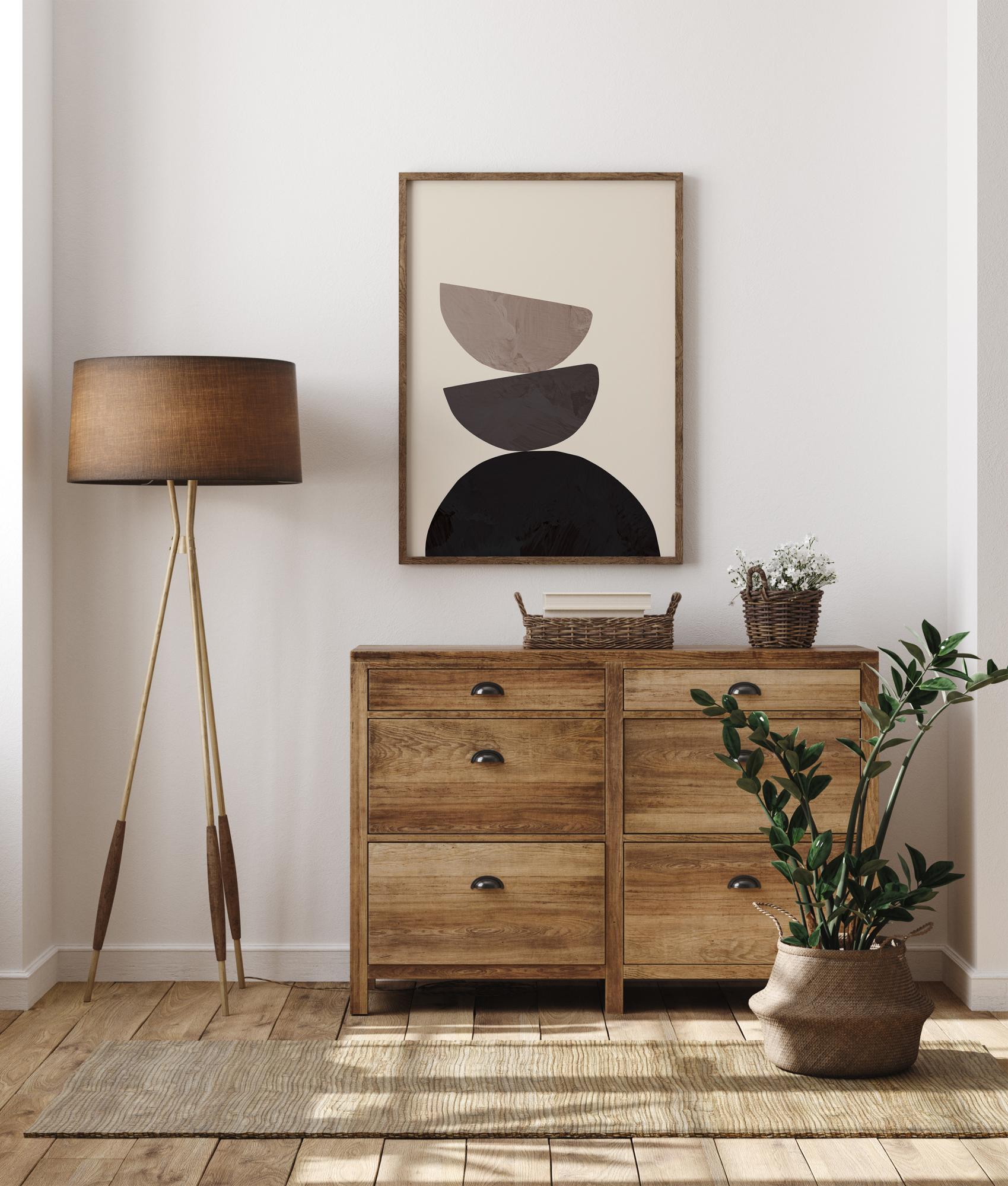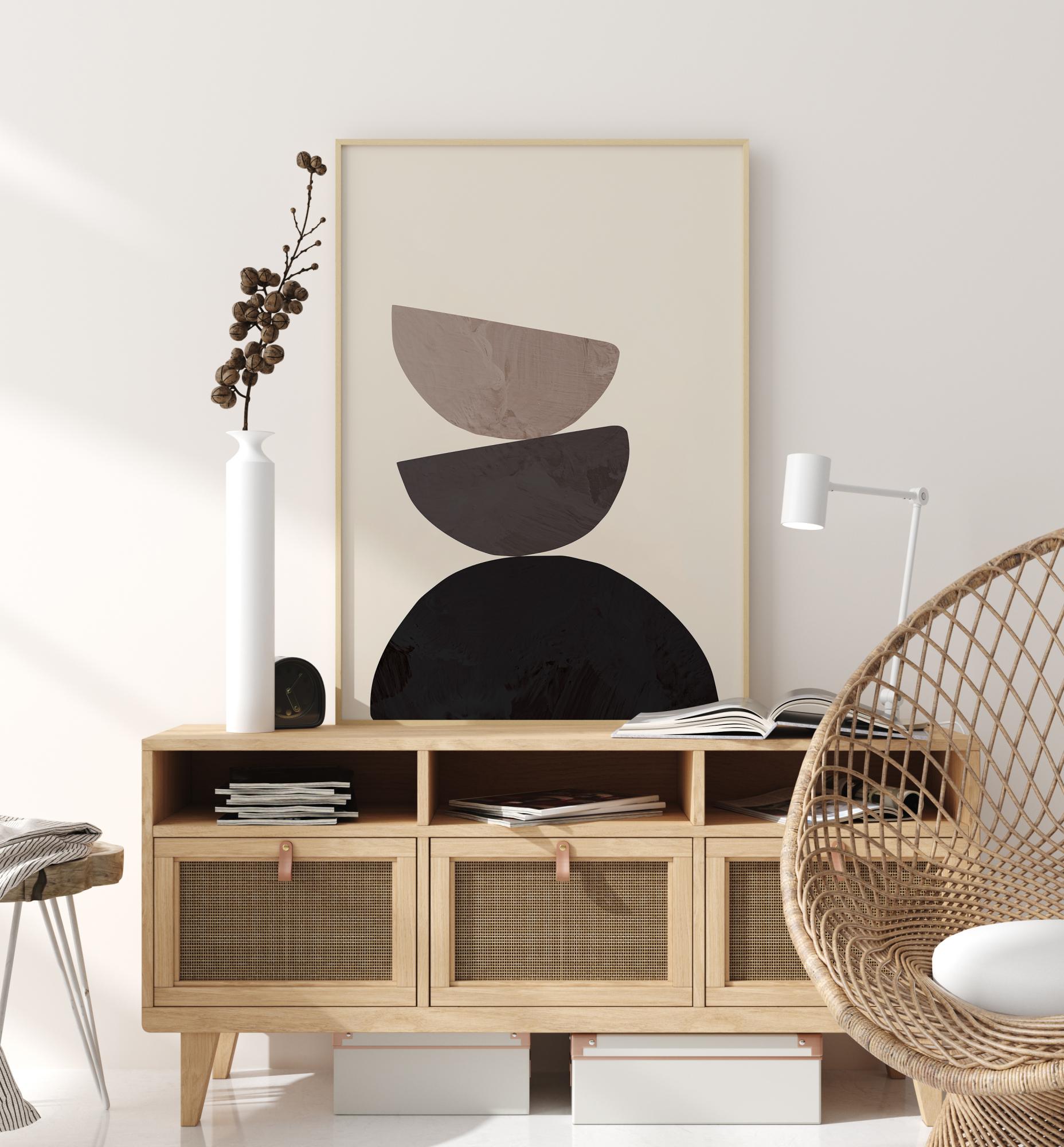 En enkel abstrakt plakat med tre forskjellige halvsirkler. Hver halvsirkel har en unik nyanse av grått, som begynner med svart på bunnen og går over til lysegrå på toppen. De balanserer på hverandre med en følelse av omhyggelig stabilitet til stykket.