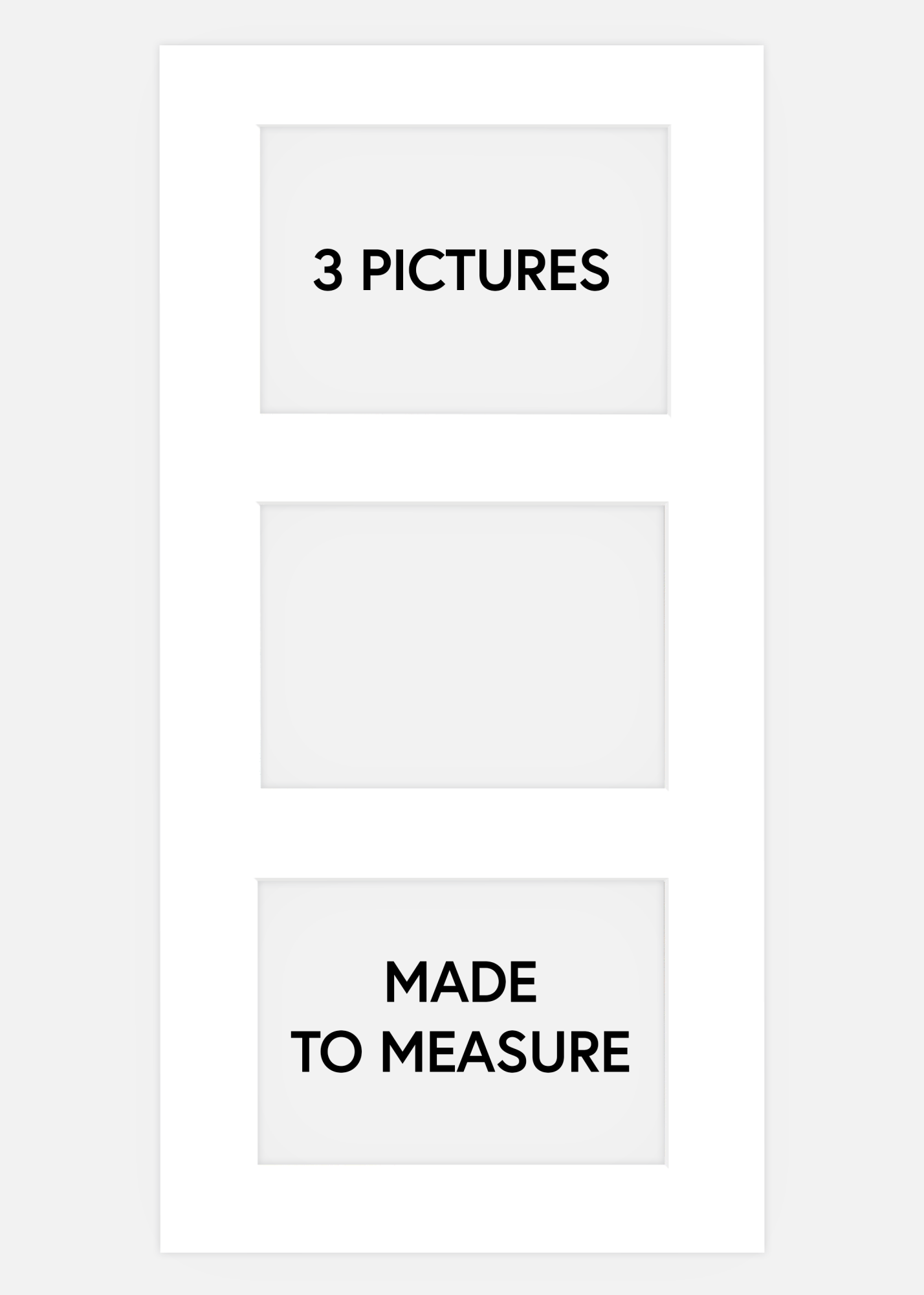 Her bestiller du enkelt collagepassepartouter med plass til 3 bilder. For å bestille angir du passepartoutets yttermål (som skal være samme mål som rammen du skal ha) deretter angir du ønsket innermål som alltid skal være 1 cm mindre enn bildene du skal ramme inn. Du kan bare bestille her om du har bilder i samme størrelse, ønsker du mer avanserte collagepassepartouter må du kontakte kundeservice for din bestilling.