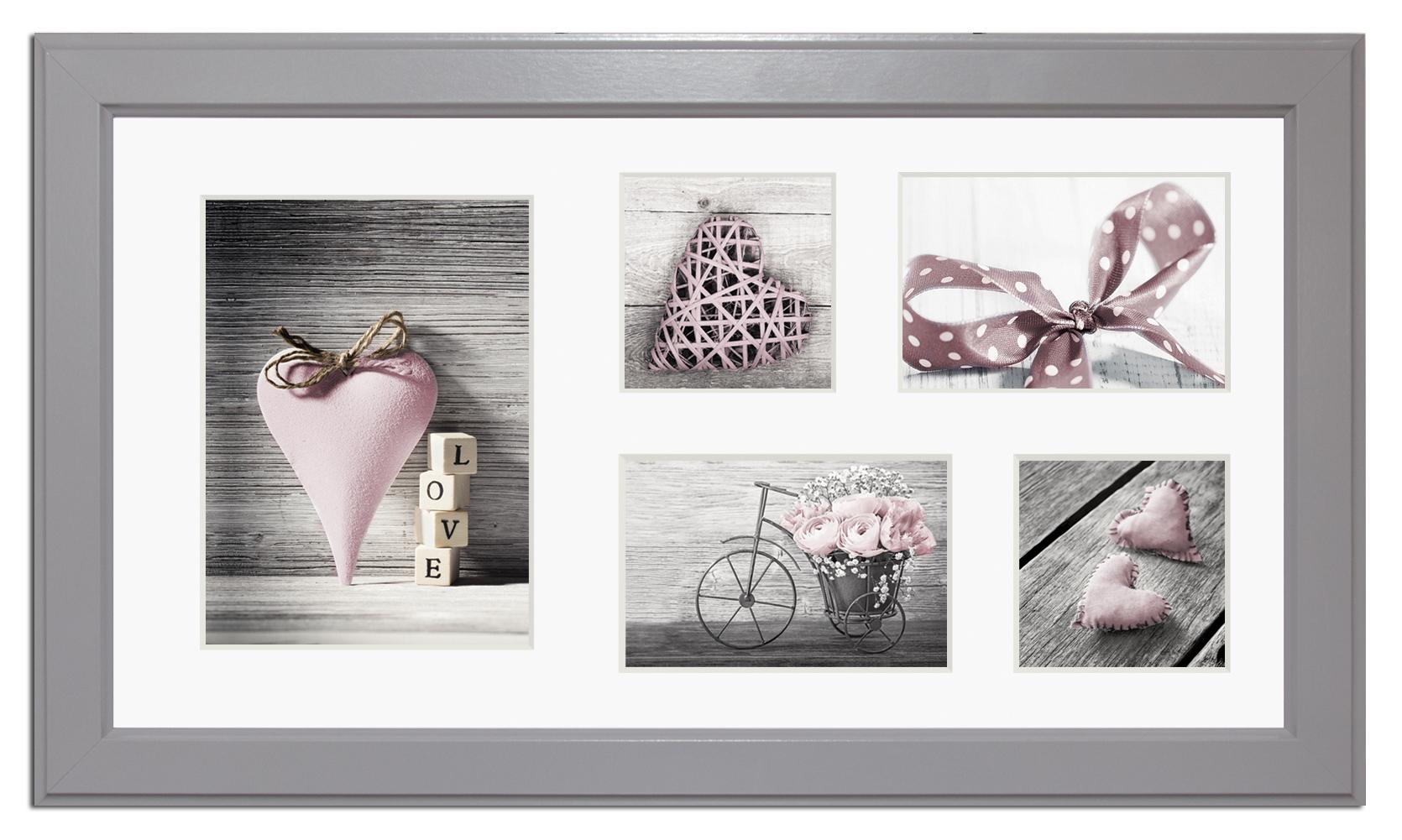 Hjemmet blir så mye mer personlig med dine favorittbilder på veggene. Her har vi en luksuriøs collageramme som går i lysegrått med et hvitt passepartout. Ettersom den er laget for foto i varierende størrelser gir den et ekstra levende inntrykk. Fyll den gjerne med bilder som følger samme tema for en vakker helhet.