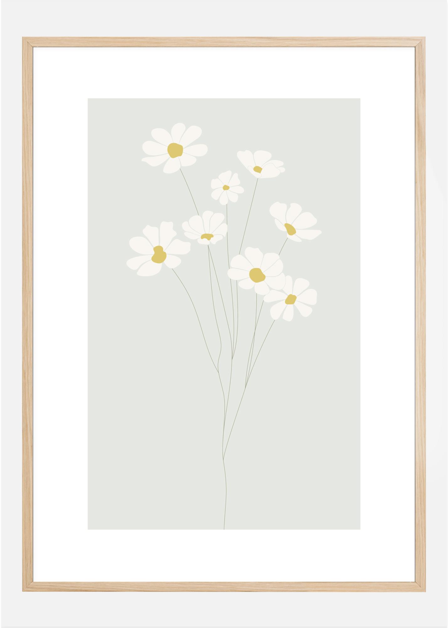 En subtil plakat med en trykket tusenfryd med et delikat utseende. De enkle hvite og gule blomstene strekker seg oppover på slanke stammer, og er satt mot en myk blekblå bakgrunn. Heng denne på barnas soverom for en myk, men likevel søt atmosfære for barna.