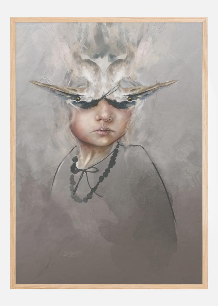 En dyster plakat med en person innhyllet i røyk. Hodet er dekket av en lue som synes å være i brann og ser ut som to fugler som er opp ned, eller en hodeskalle. Øynene er mystisk dekket av skygger, mens figuren opprettholder fasaden. Heng opp denne plakaten hjemme for noen spennende tolkninger.