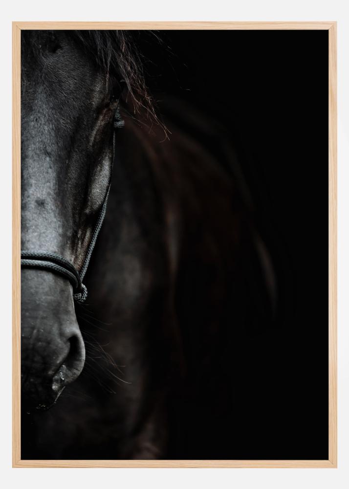 En fotografisk poster for hesteelskeren! Her er en mørk hest fotografert rett forfra mot en mørk bakgrunn. Ansiktet er vakkert opplyst mens hestens bakre deler smelter inn i bakgrunnen. Kompletter gjerne med noe fra vårt store utvalg av rammer.