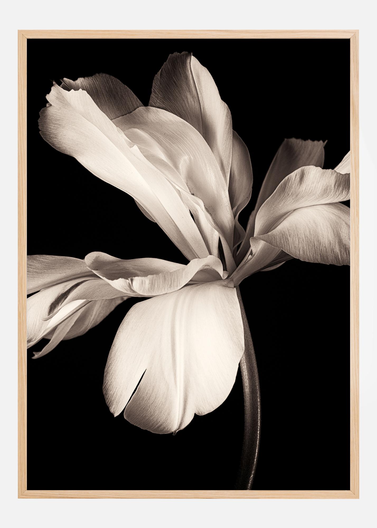 En makro-plakat med en blomst og kronbladene dens. De myke bleke hvite kronbladene krøller og bretter seg over en sterk stilk på en enkel svart bakgrunn. Makro-objektivet fanger alle detaljene som gjør dette til et godt alternativ for alle blomsterentusiaster. Beundre detaljene i dette bildet.