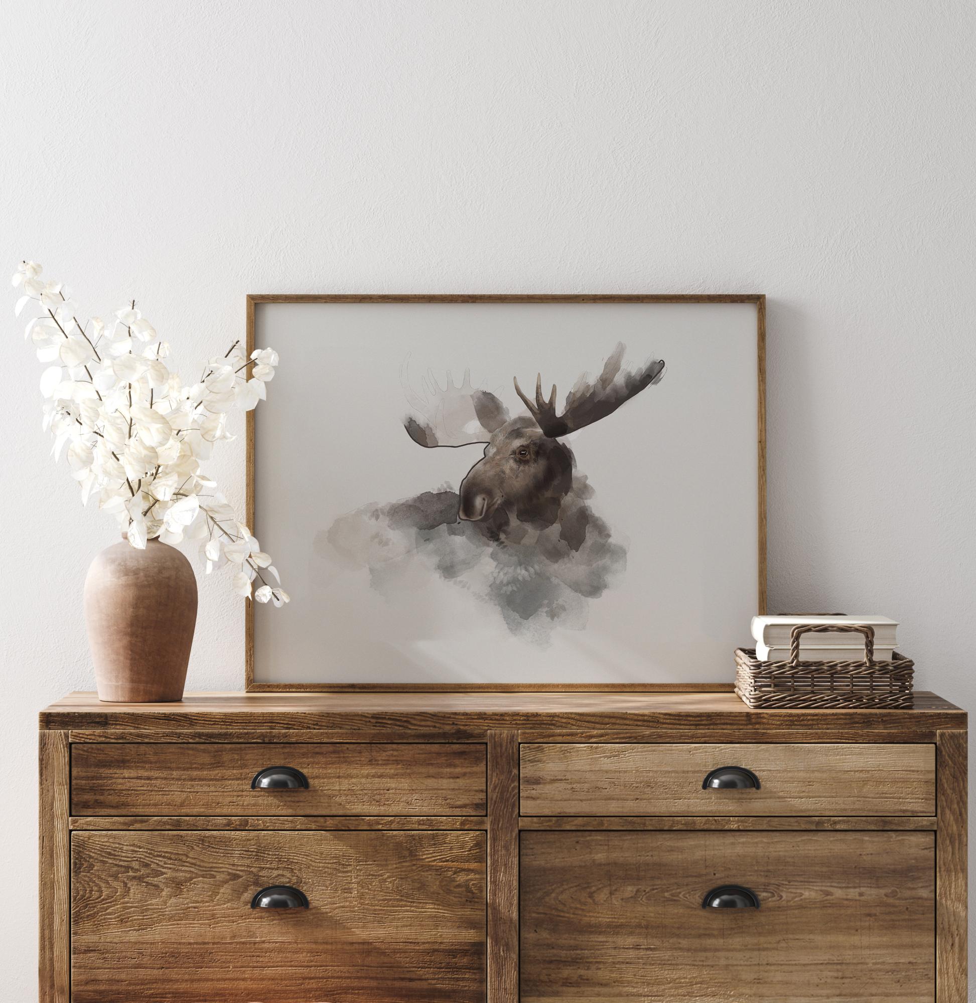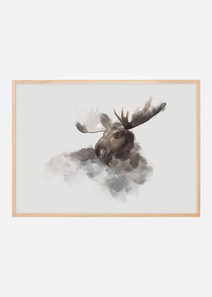 En akvarellplakat med et elghode. De myke penselstrøkene i vannmaling skaper gradvis elgens ansikt, men geviret er ikke helt utformet. Heng opp dette skyaktige bildet på en nøytral vegg i myke farger for å opprettholde hjemmets eleganse.
