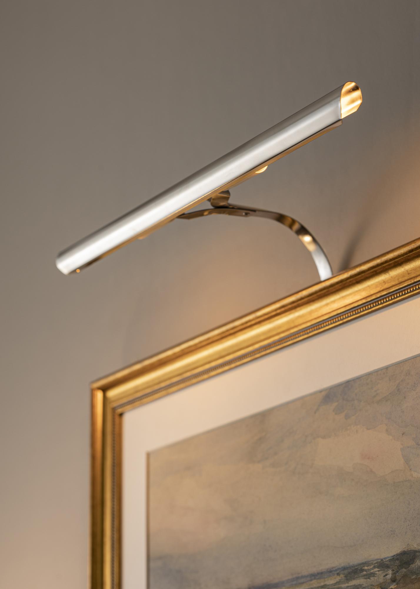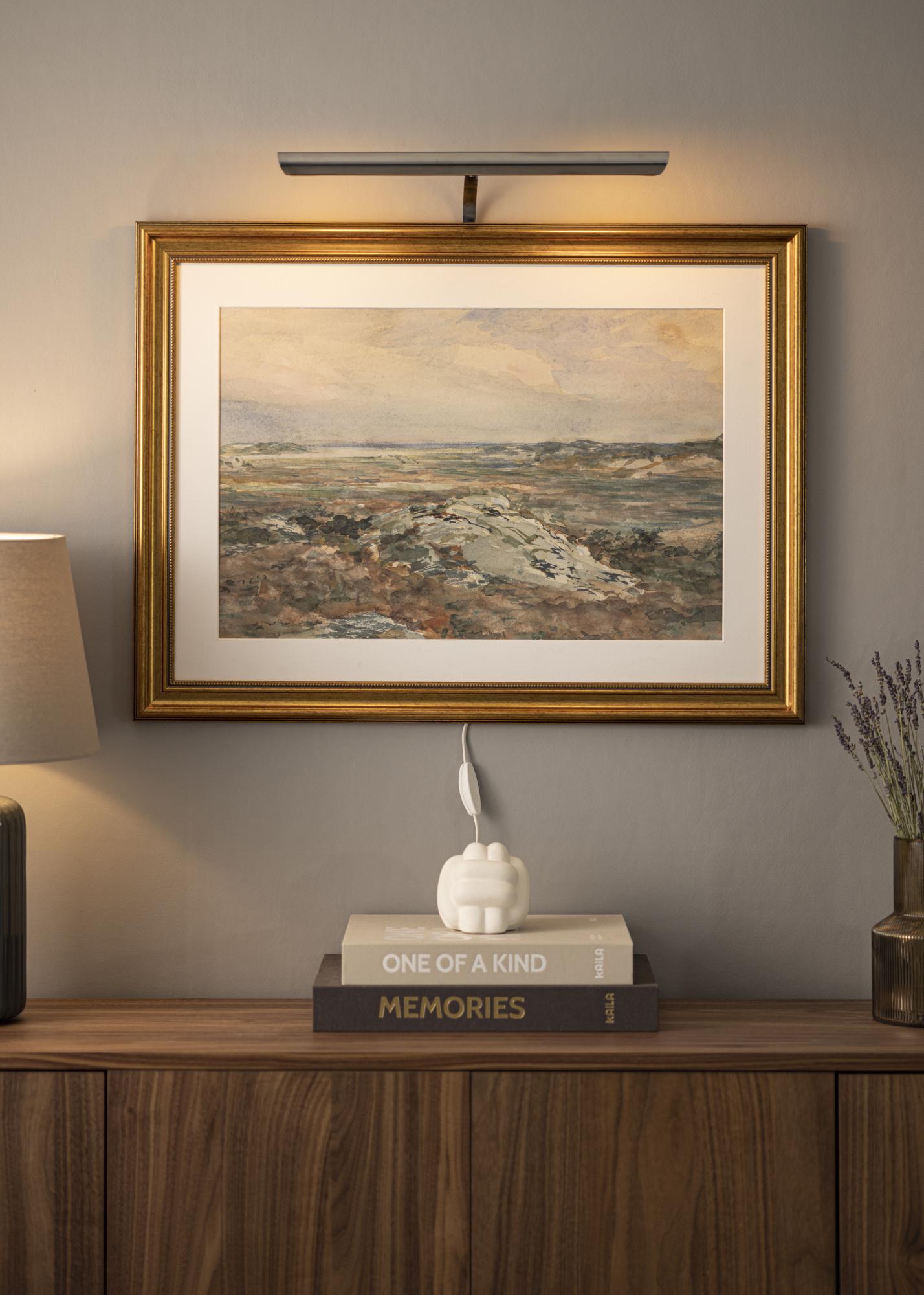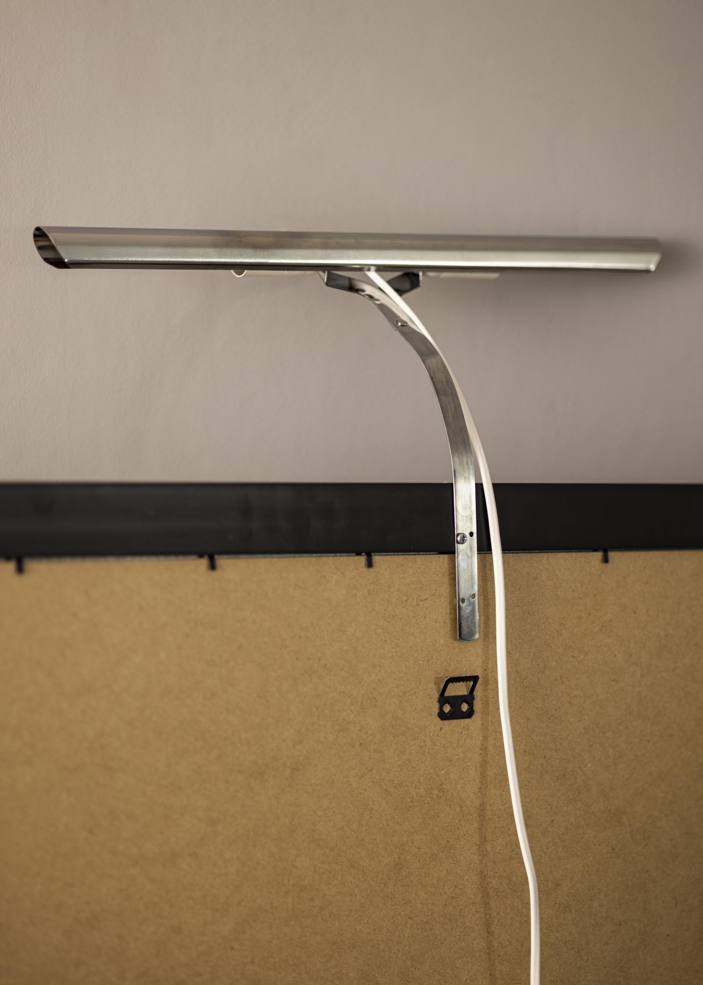 Til hvilke rammer passer belysningen? Vanligvis fester du maleribelysningen på baksiden av rammen, men ulempen med dette er at det krever en treramme (visse komposittrammer går også bra) som har en bred profil for at det skal være mulig å skru inn skruer i rammen. Med vårt veggfeste så slipper du å tenke på det, men fester bare belysningen direkte på veggen bak rammen.
