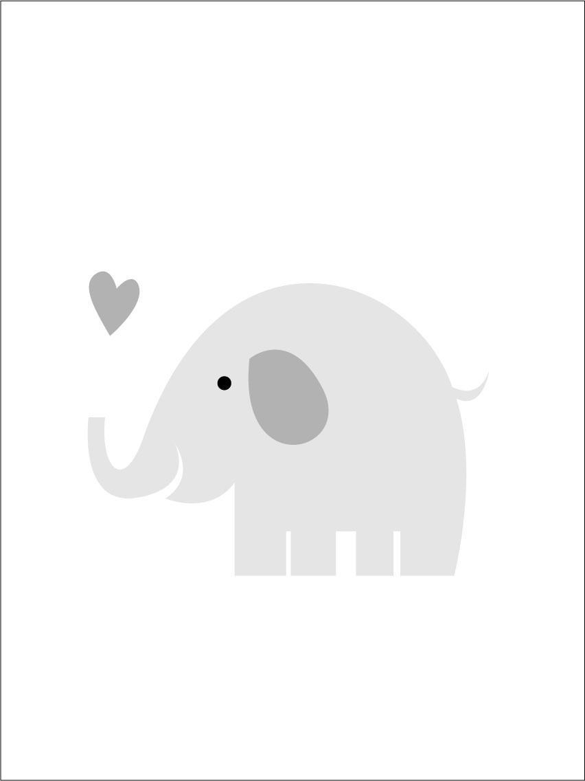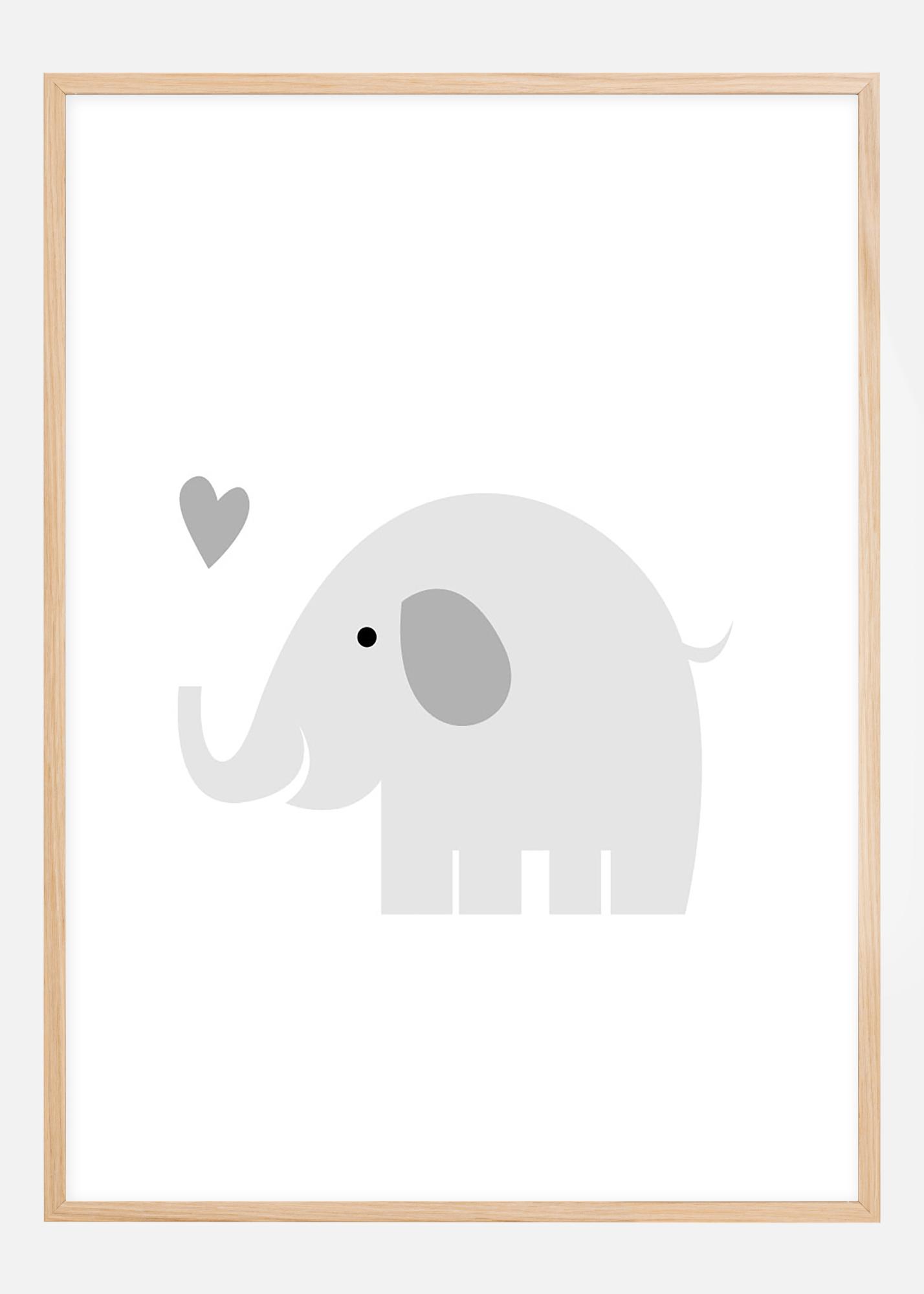 Plakat med grafisk trykk av en søt elefant og et hjerte i tåkegrå nyanse mot hvit bakgrunn. Noe for den som liker alle dyrene på savannen, men passer kanskje først og fremst på rommet til yngre barn. Plakaten kan kombineres med trykk av andre dyr eller elefanter i samme fargekombinasjon for å skape en herlig eventyrstemning på barnerommet.