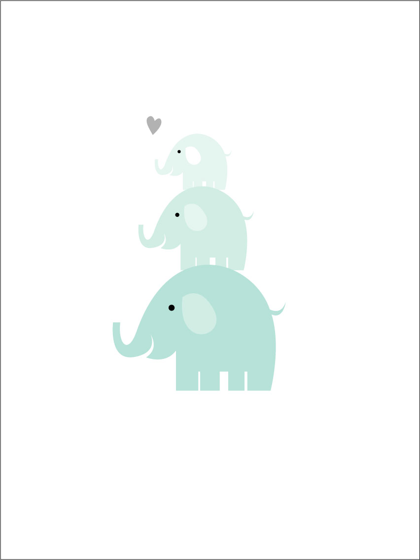 Plakat med grafisk trykk av tre søte elefanter i isblå nyanse stablet oppå hverandre mot hvit bakgrunn. Noe for den som liker alle dyrene på savannen, men passer kanskje først og fremst på rommet til yngre barn. Plakaten kan kombineres med trykk av andre dyr eller elefanter i samme fargekombinasjon for å skape en herlig eventyrstemning på barnerommet.
