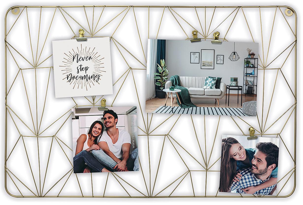 Collageramme designet som oppslagstavle, der bildene festes med klyper. Rammen er laget av metall og kommer i en gylden nyanse. Siden det er deg som fester bildene, kan du selv velge om du vil mikse bilder av ulik størrelse eller slippe kreativiteten løs ved for eksempel å henge opp mindre plakater og fine lapper! Rammen har et utvendig mål på 62 x 41 cm. Rammen passer ekstra godt over skrivebordet, på kjøkkenet eller andre steder hvor den kommer til sin dekorative og funksjonelle rett. Har veggfeste.