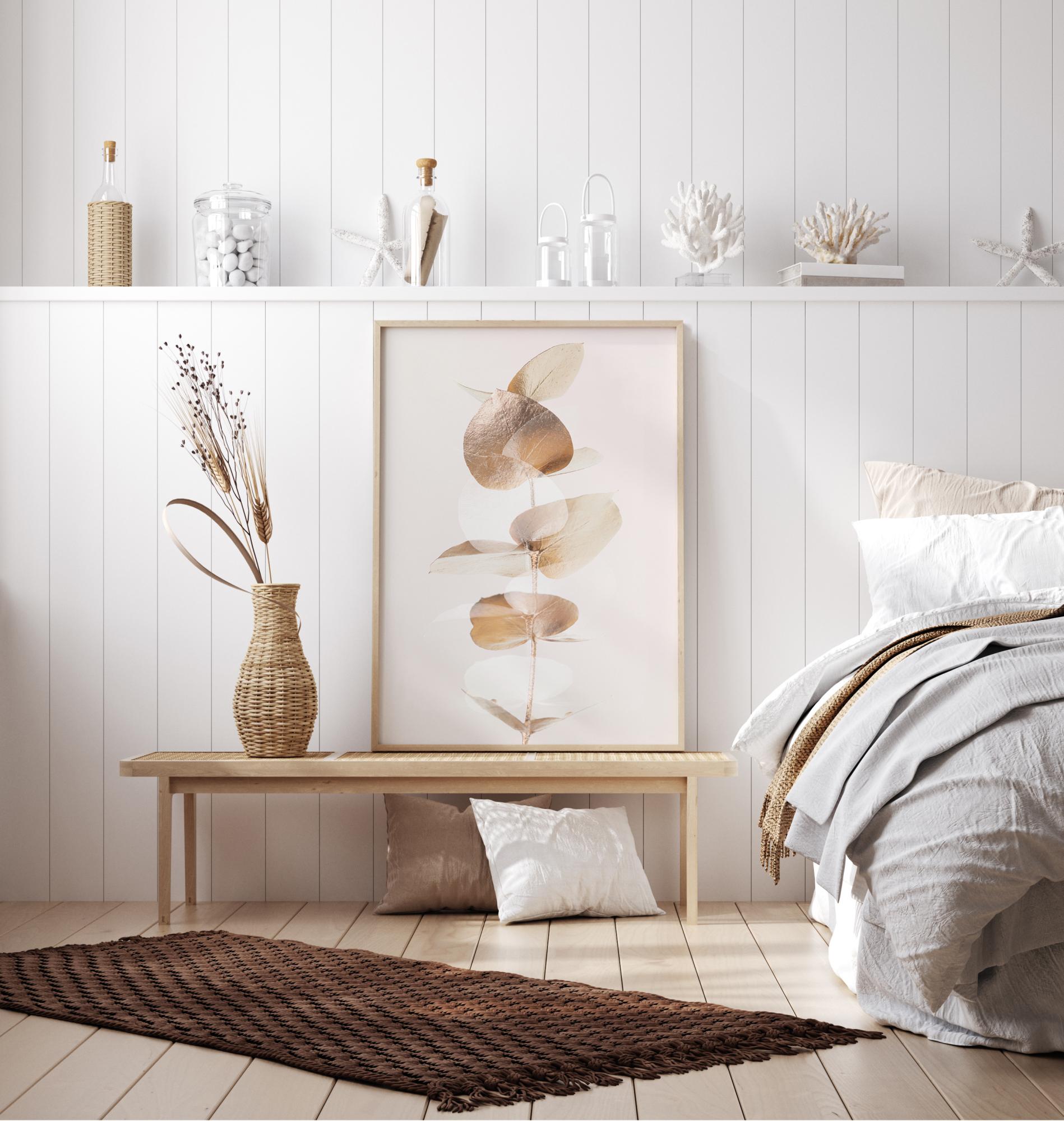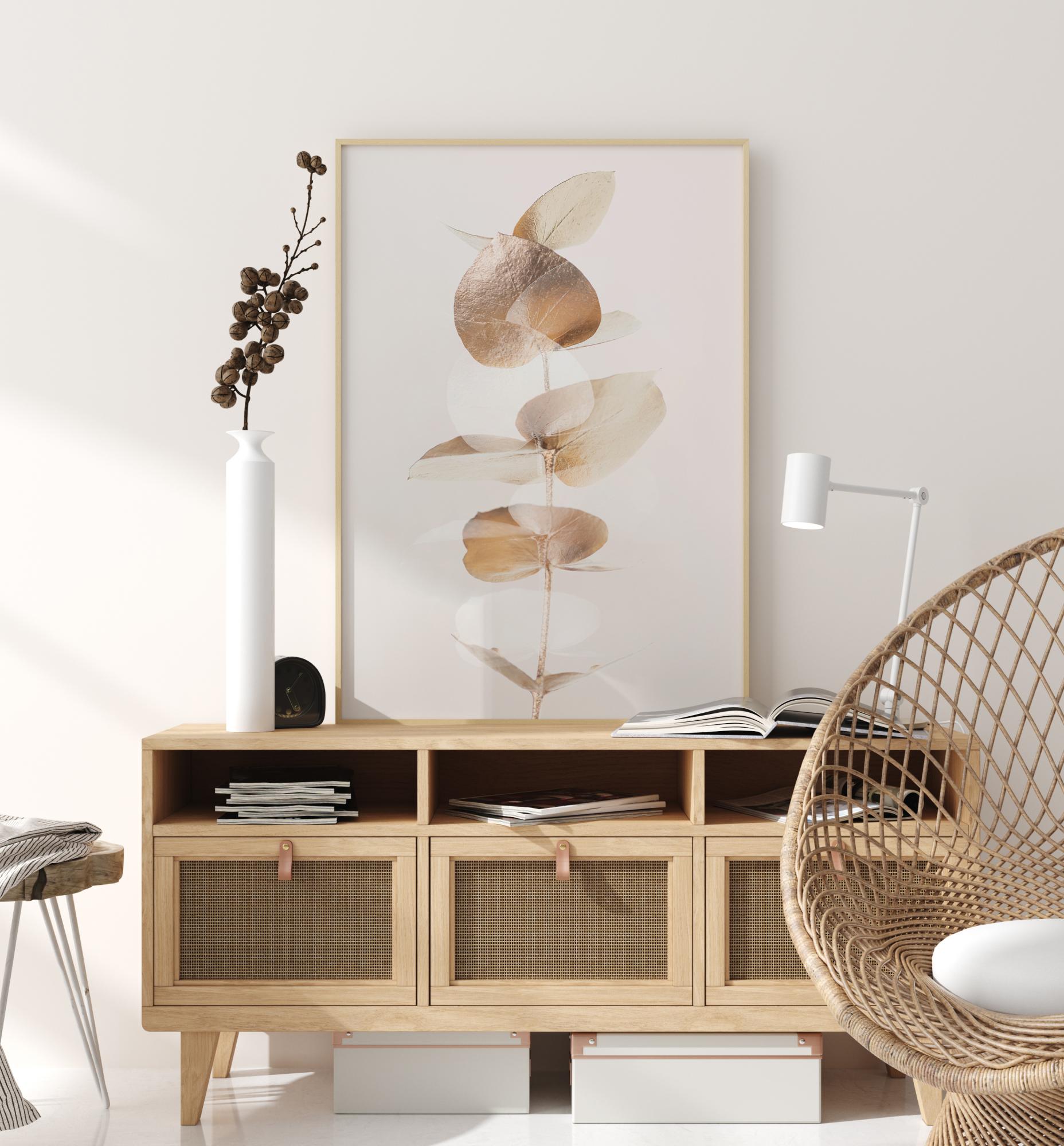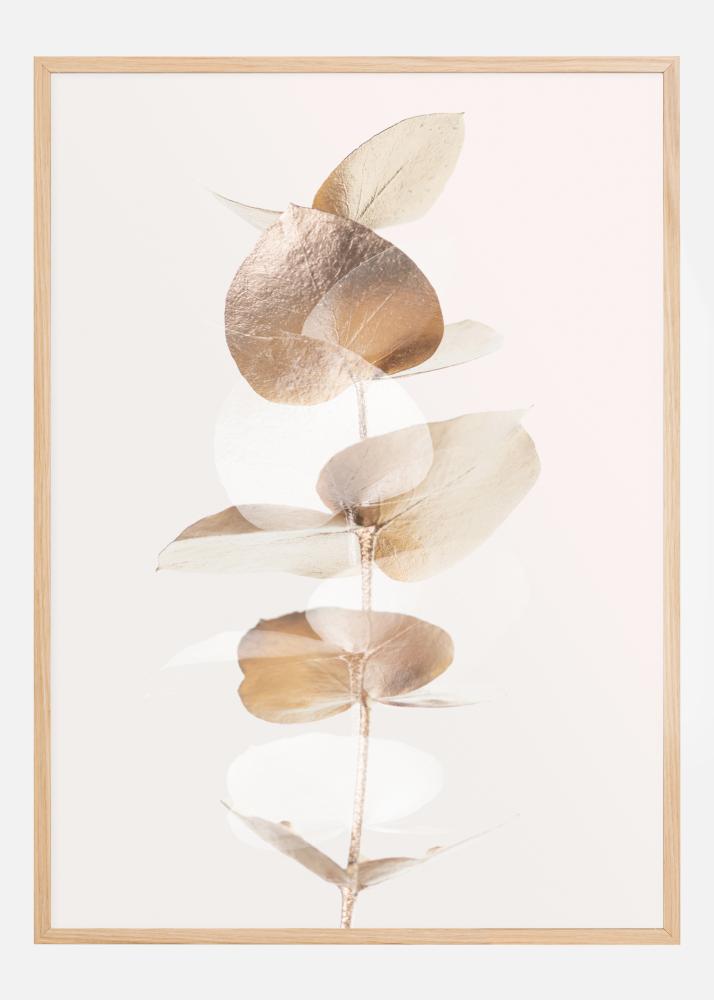 Et nærbilde av gylne eukalyptusblader. Den enkle elegansen i dette stykket fremheves av den vanlige hvite bakgrunnen. De gylne bladene glinser forsiktig der de fyller plakaten med deres myke glød som fremkaller en følelse av ro i huset.