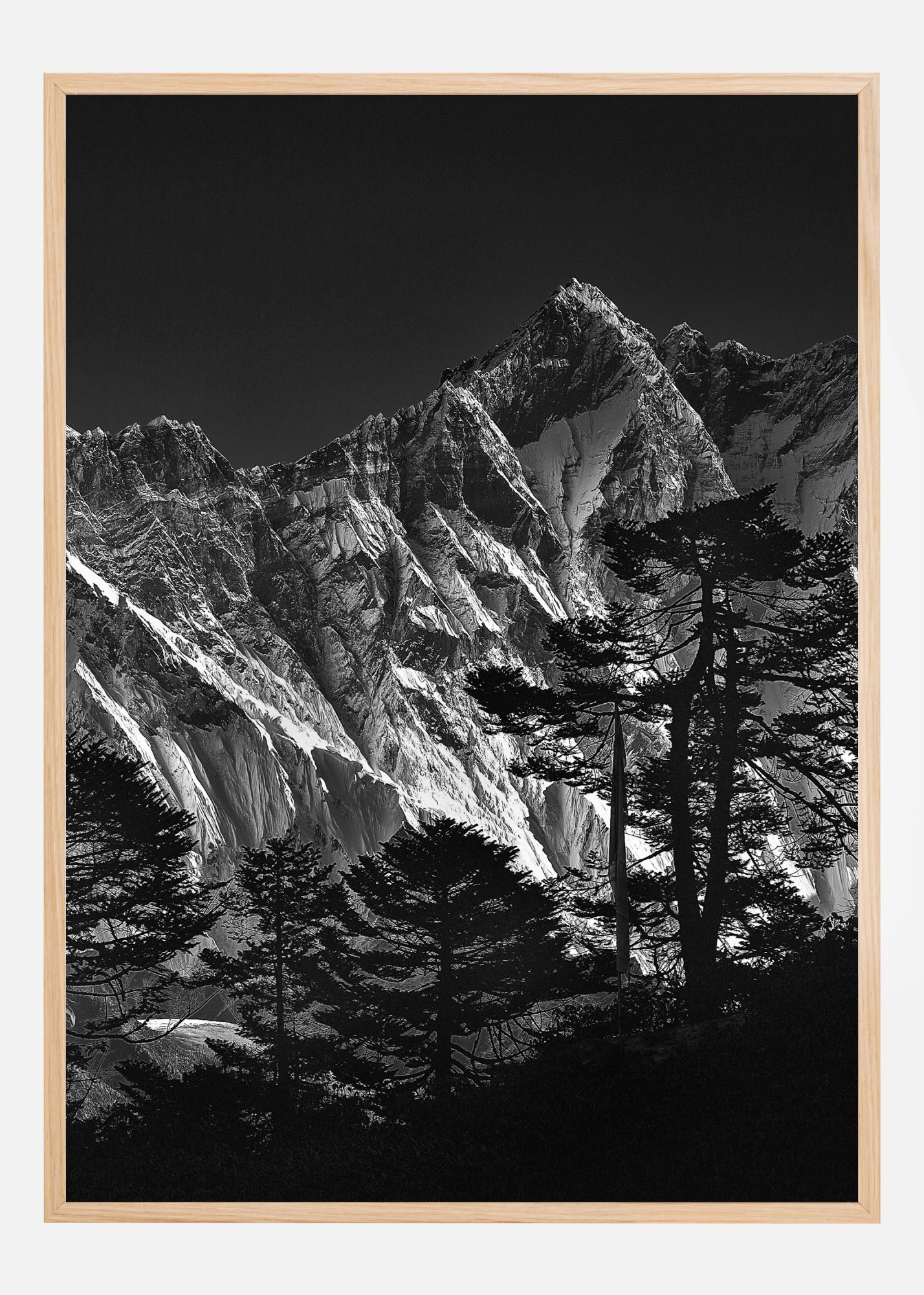 En fjellplakat med siden av Mount Everest. Dette dramatiske svart-hvitt-bildet viser de rene sidene av fjellet i en lys hvitfarge. Mørke trær sitter i forgrunnen, og en mørk himmel omgir fjellet bak. Føl dramaet og faren i dette bildet.