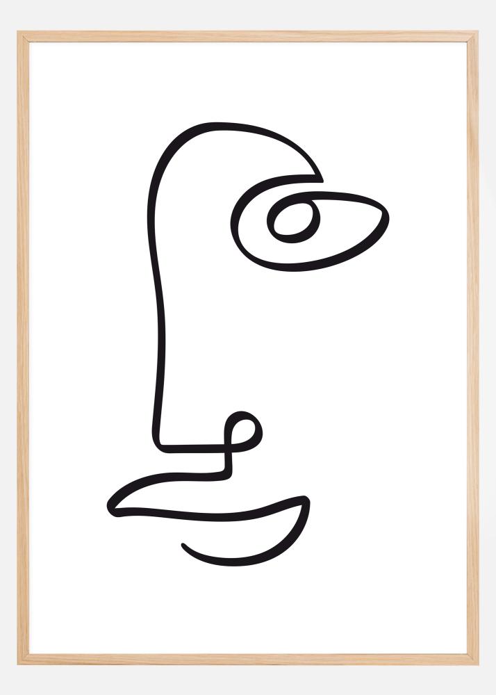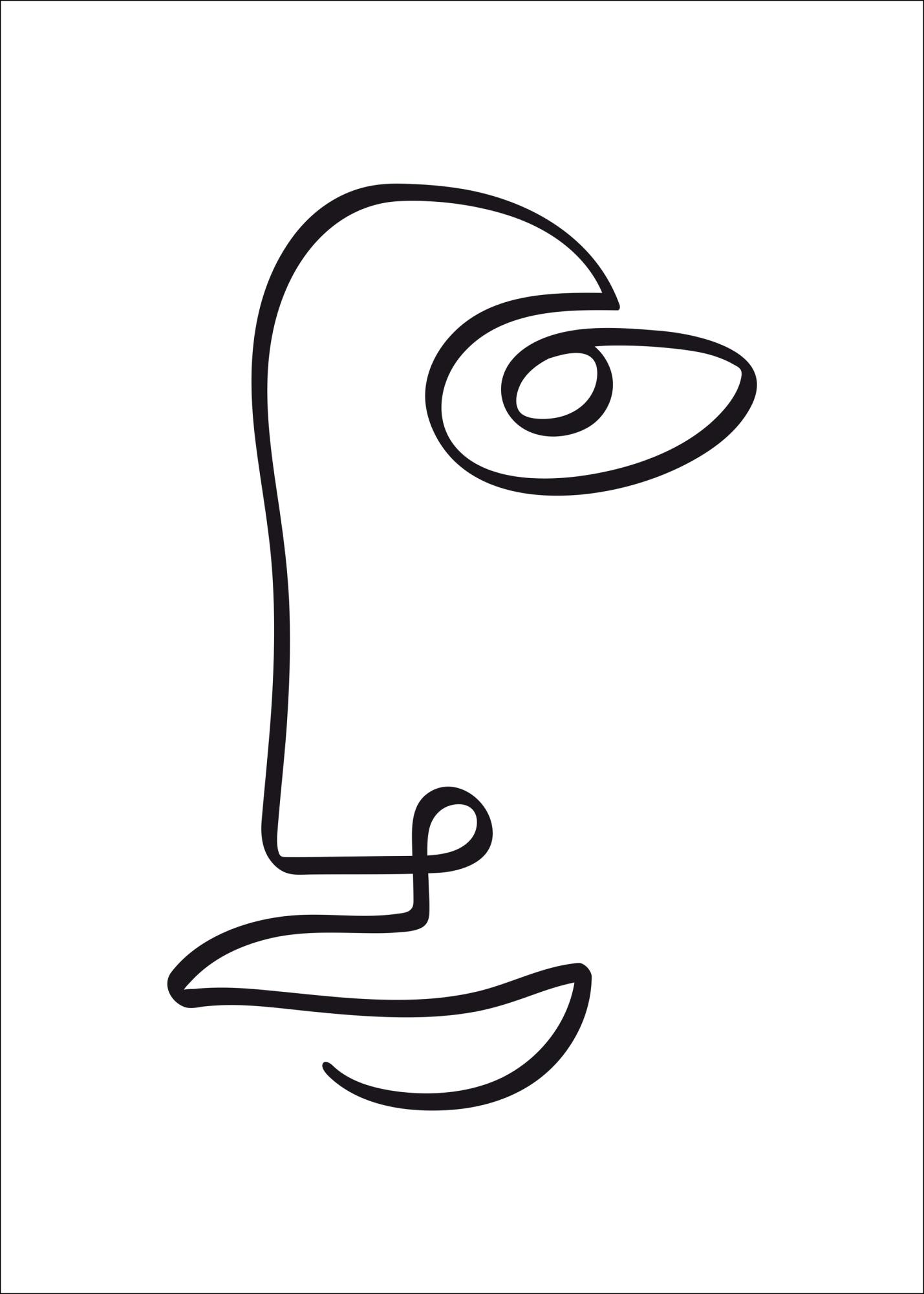 En abstrakt plakat med et ansikt i svart linje. Den enkle svarte linjen vrir seg rundt stykket for å skape én side av et ansikt, uten å forlate papiret. Betrakt dette enkle bildet når du henger det opp hjemme, og finn andre bilder som skjuler seg i det samme.