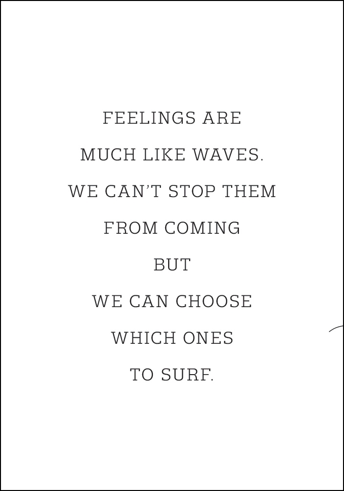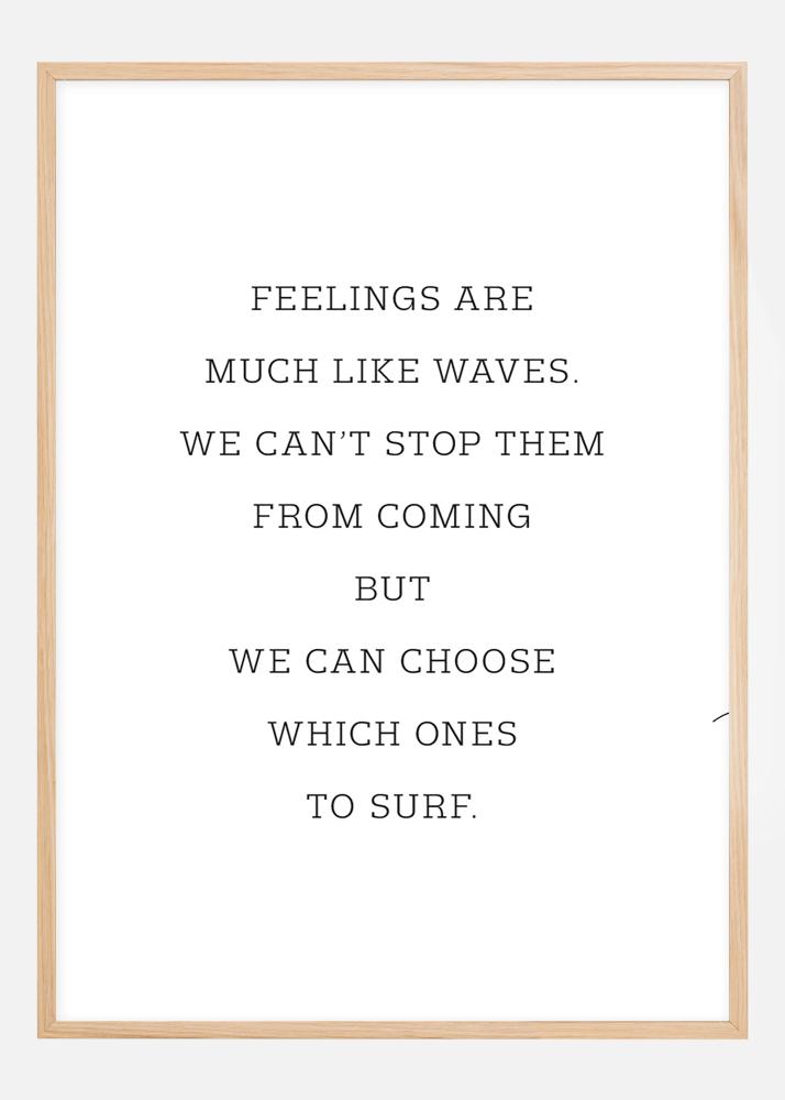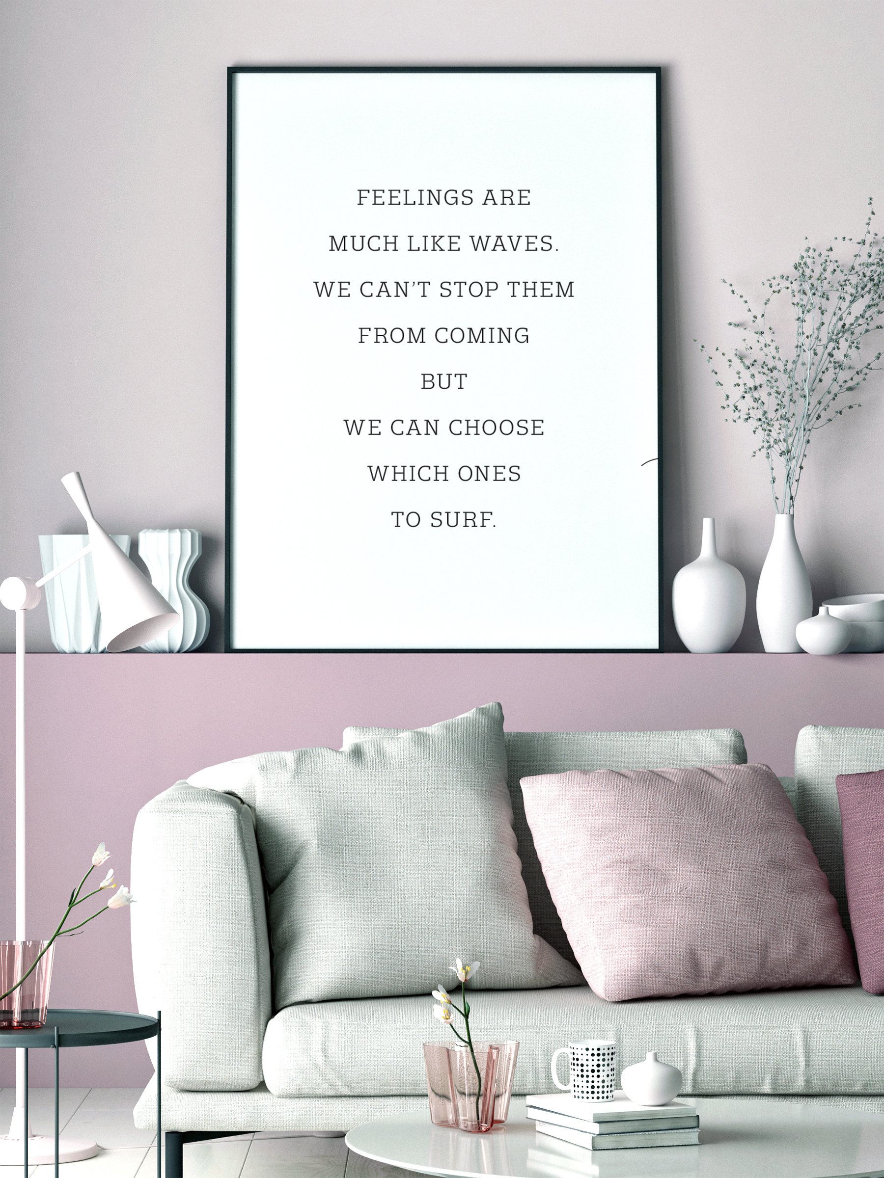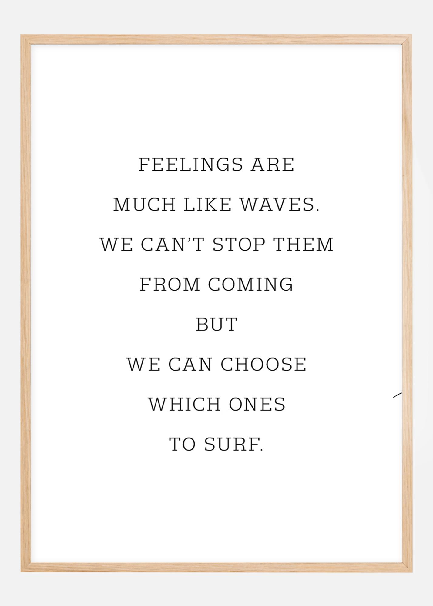 En motiverende plakat for å holde deg i gang hver dag. «Følelser er som bølger. Vi kan ikke stoppe dem fra å komme, men vi kan velge hvilke som skal surfe.» Kickstart dagen med dette sterke sitatet i en enkel skriftfont satt mot en vanlig hvit bakgrunn.