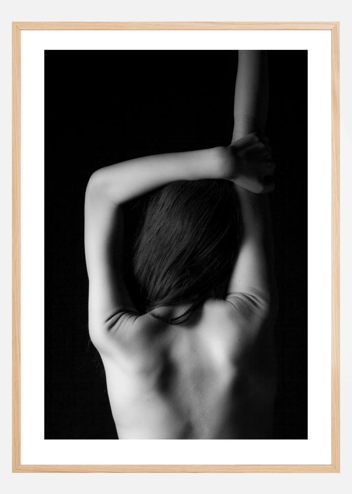 En portrett-plakat av en kvinnes rygg. Dette svart-hvitt-bildet fremhever de myke musklene på ryggen da hun strekker en arm høyt og bøyer den andre over hodet. Deler av henne er innhyllet i skygge. Ta med denne plakaten hjem for en kunstnerisk figurtegning i huset ditt.