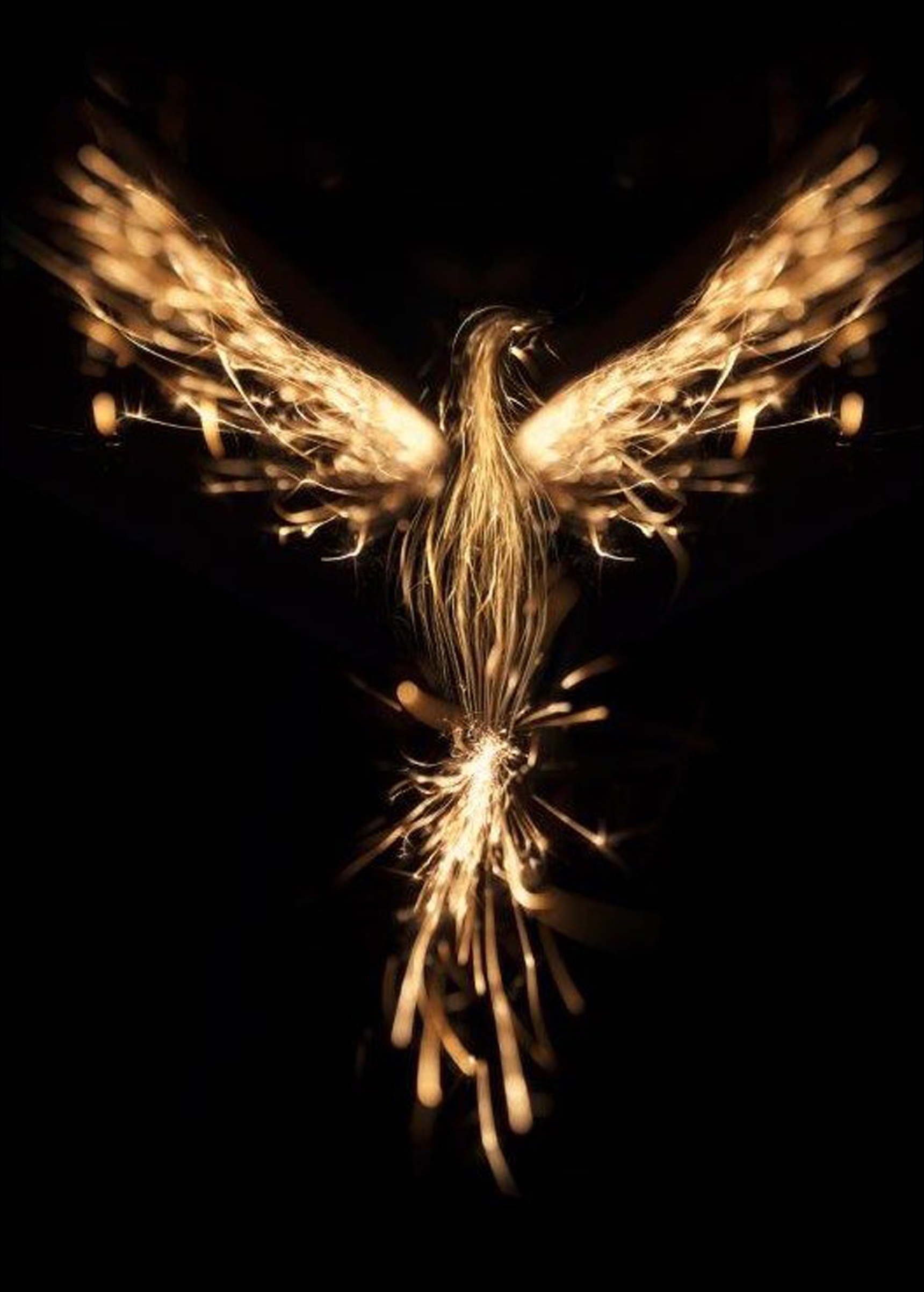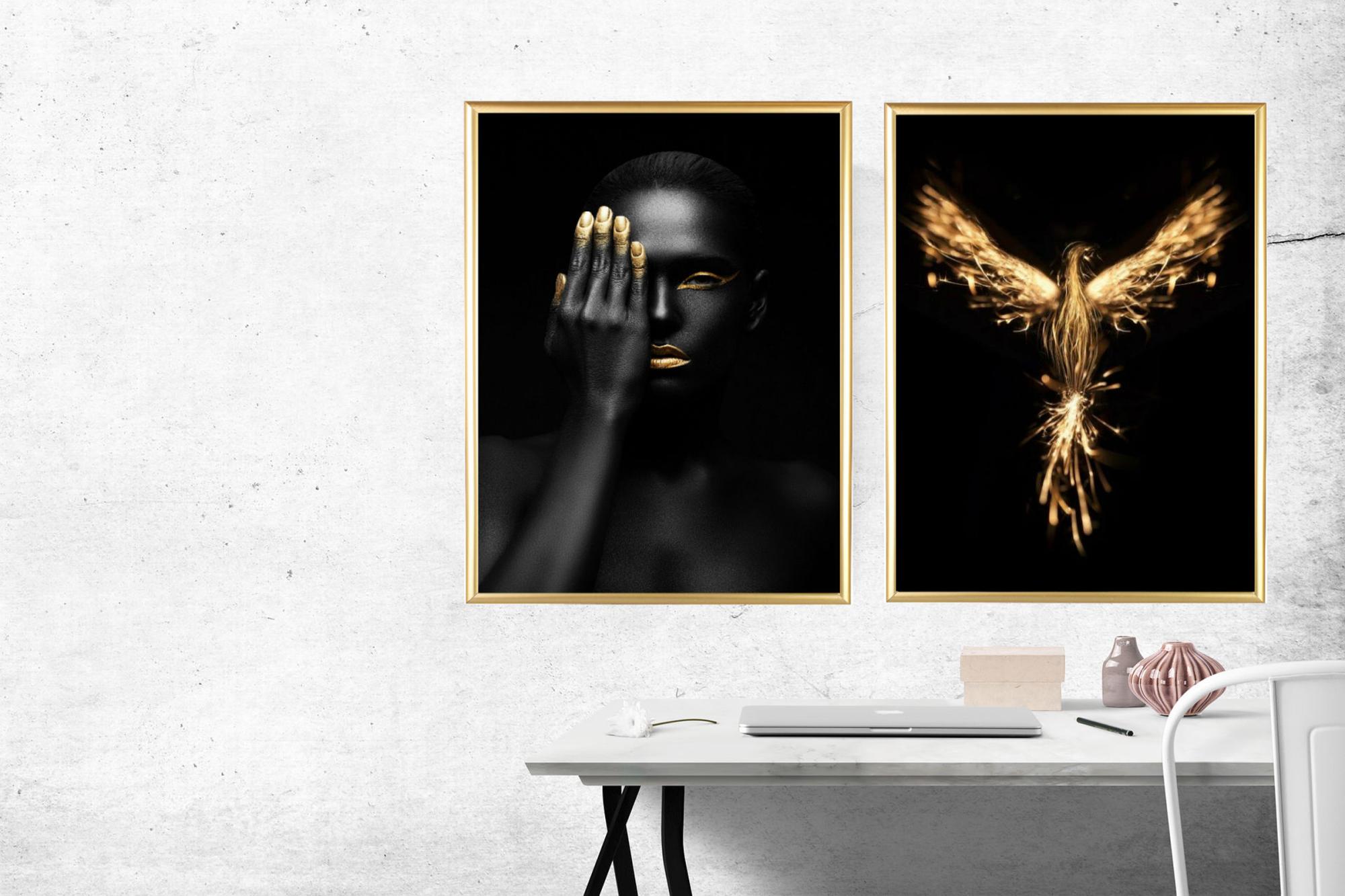 Gjennom grafisk kunst tar fuglen Føniks form i et fyrverkeri av gullfargede toner mot en svart bakgrunn. En varm og behagelig poster i et minimalistisk format, perfekt å matche med andre favoritter i et større collage.