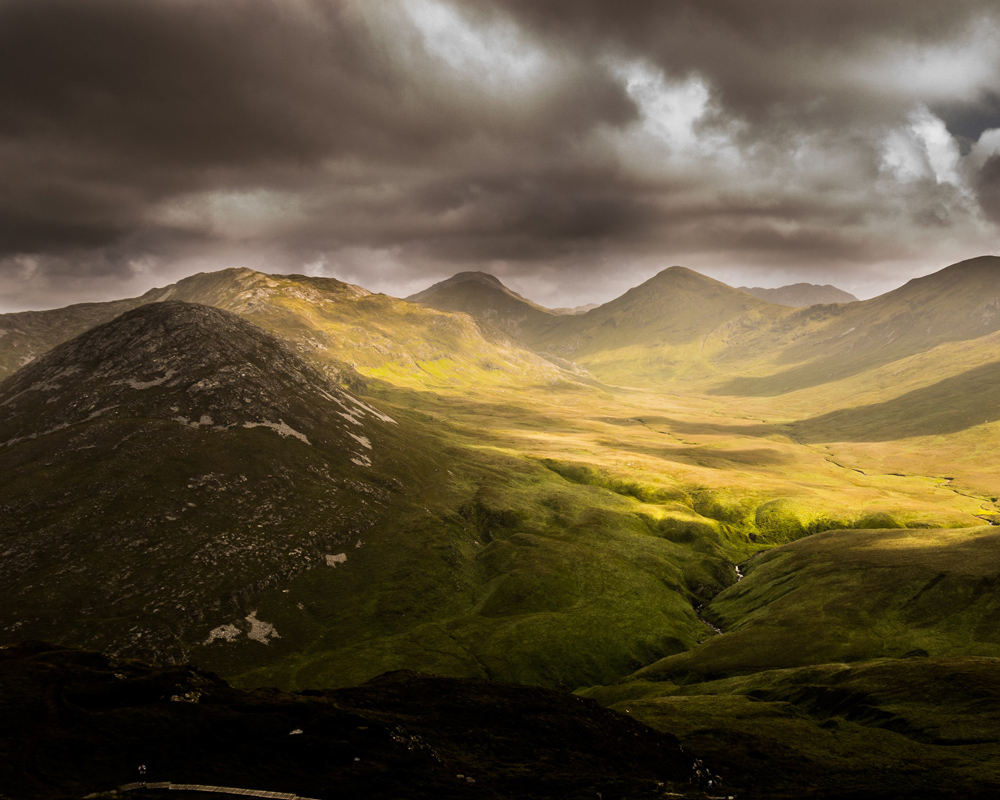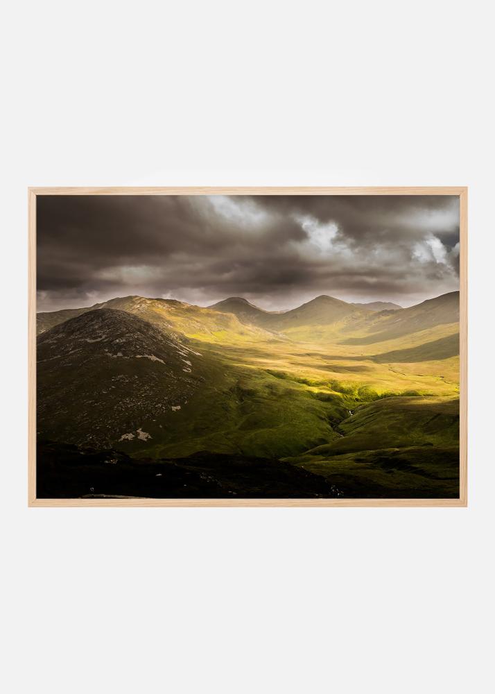 Dramatisk landskapsportrett med stormskyer som tårner over en fjellkjede, mens solen lyser opp dalen nedenfor. Dempede farger understreker det dramatiske motivet og gjør at fotografiet virkelig skiller seg ut. Bildet er best egnet i en ramme som understreker dybden, men som ikke tar oppmerksomheten bort fra motivet.
